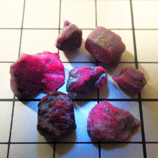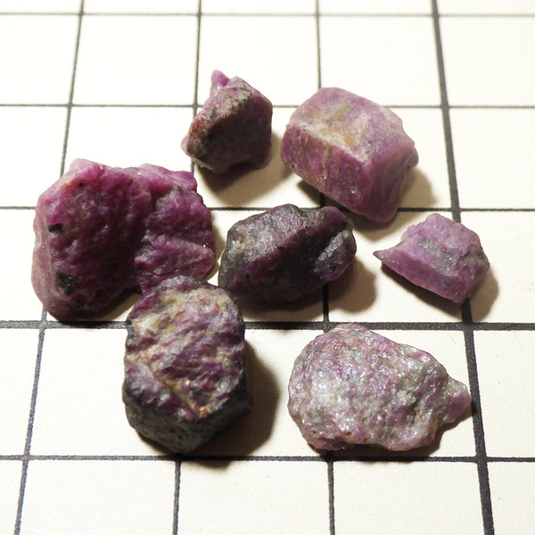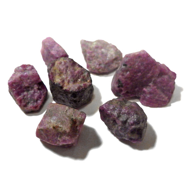 南アフリカ産のルビー原石です。 限られた鉱脈から採掘される、貴重なルビーの小さな原石を複数個詰め合わせています。ルビーは宝石名で赤色のコランダム(鋼玉)のことをルビーと呼びます。その他の色のコランダムは全てサファイアになります。ルビーの結晶が小さいのは、赤い色の原因である微量のクロムが結晶成長を妨げるためで、赤色のルビーのみ飛びぬけて貴重になります。ブラックライトを照射することでルビーレッドが鮮やかに蛍光します。