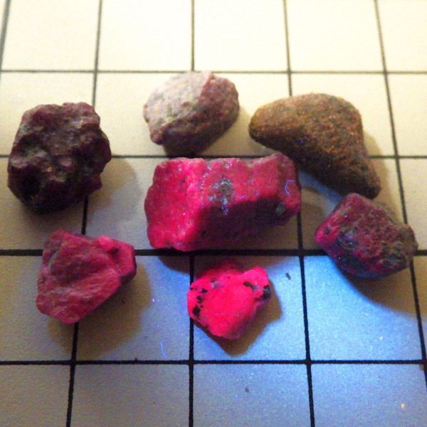南アフリカ産のルビー原石です。 限られた鉱脈から採掘される、貴重なルビーの小さな原石を複数個詰め合わせています。ルビーは宝石名で赤色のコランダム(鋼玉)のことをルビーと呼びます。その他の色のコランダムは全てサファイアになります。ルビーの結晶が小さいのは、赤い色の原因である微量のクロムが結晶成長を妨げるためで、赤色のルビーのみ飛びぬけて貴重になります。ブラックライトを照射することでルビーレッドが鮮やかに蛍光します。