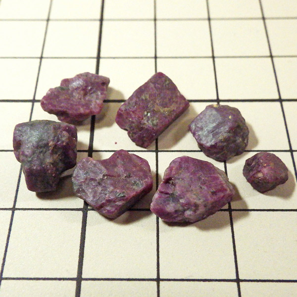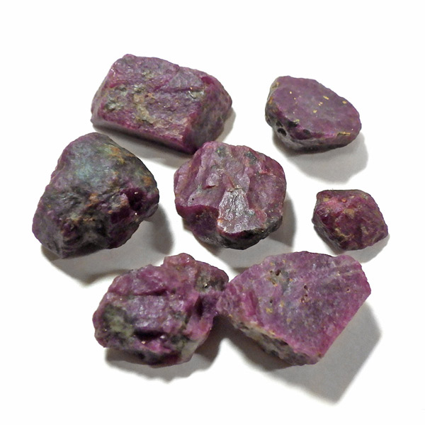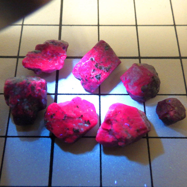 限られた鉱脈から採掘される、貴重なルビーの小さな原石を複数個詰め合わせています。ルビーは宝石名で赤色のコランダム(鋼玉)のことをルビーと呼びます。その他の色のコランダムは全てサファイアになります。ルビーの結晶が小さいのは、赤い色の原因である微量のクロムが結晶成長を妨げるためで、赤色のルビーのみ飛びぬけて貴重になります。ブラックライトを照射することでルビーレッドが鮮やかに蛍光します。