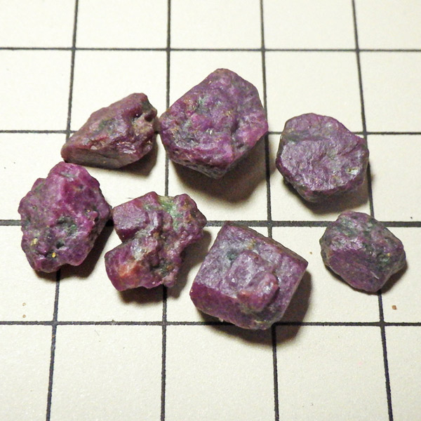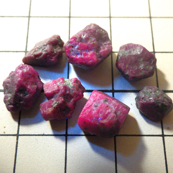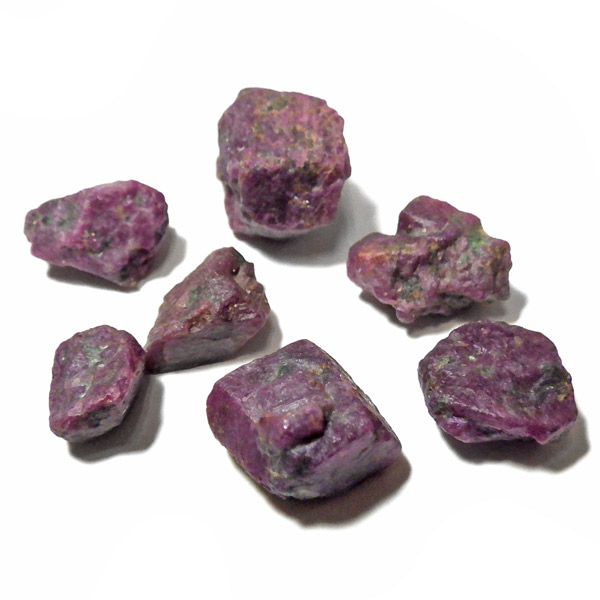 限られた鉱脈から採掘される、貴重なルビーの小さな原石を複数個詰め合わせています。ルビーは宝石名で赤色のコランダム(鋼玉)のことをルビーと呼びます。その他の色のコランダムは全てサファイアになります。ルビーの結晶が小さいのは、赤い色の原因である微量のクロムが結晶成長を妨げるためで、赤色のルビーのみ飛びぬけて貴重になります。ブラックライトを照射することでルビーレッドが鮮やかに蛍光します。