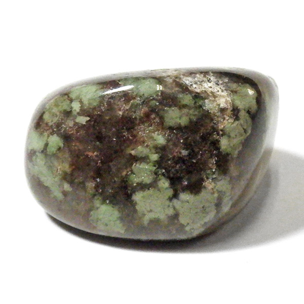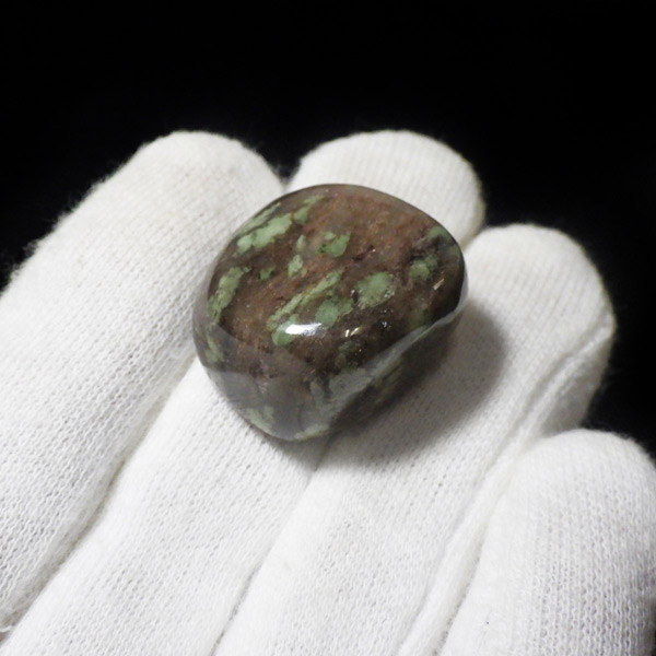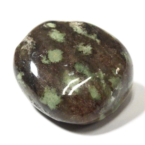 オーストラリア産のナンドライト、タンブルです。ナンドライトはオーストラリア・ニューサウスウェールズ州の小さな町ナンドルが産地である、希少であまり知られていない岩石です。ナンドライトという名前は、この産地に由来しています。ナンドライトの本質的な分類はエジリン閃長岩(エジリン・サイアナイト)にあたります。茶色やベージュ系のサイアナイト母岩の中に、深いグリーンのエジリンがドット状に散りばめられており、その独特な模様と色合いが非常に魅力的です。