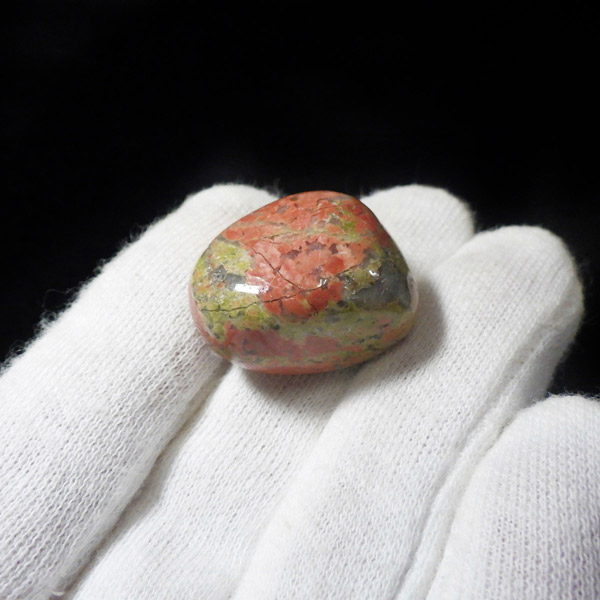 エピドート(緑簾石)、クローライト(緑泥石)、フェルドスパー(長石)、クォーツ(石英)の混合石で、アメリカのノースカロライナ州のユナカ山地が原産地で、地名に因んで名付けられました。変質して出来た火成岩で、緑色が強いもの、ピンクが多めに入ったものなど個体差があり、その独特な色合いと模様がおもしろいです。