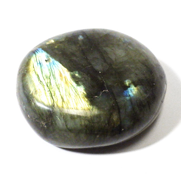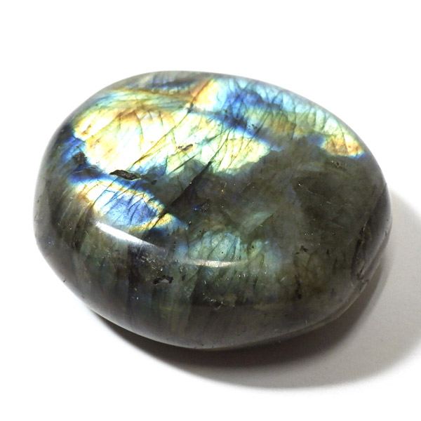 マダガスカル産のラブラドライト磨きペブルです。 見る角度によってオーロラのような色彩を変える美しい光を持つのが特徴です。 石自体はグレーなどの地味めな色合いをしていますが、そこに鮮やかな輝きが浮かび上がるところから「アゲハ蝶の羽」に例えられる事もある美しい石です。 ラブラドライトは、月・太陽を象徴するといわれています。根気強い実行力を養い、信念を貫けるよう導く力があるとされます。そして、直感力・洞察力・創造性を高めてくれるでしょう。自信を失いかけた時に、生まれた意味・生きる意味を気づかせるサポートをしてくれ、生きる力を引き出してくれるといわれています。