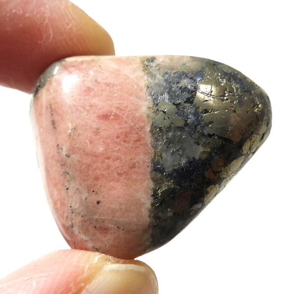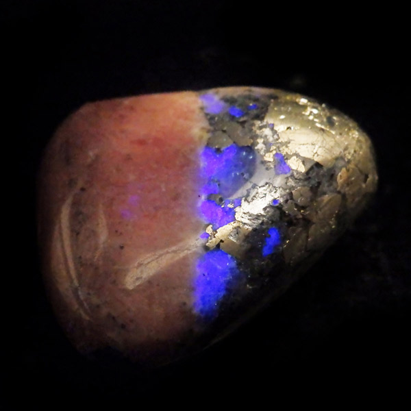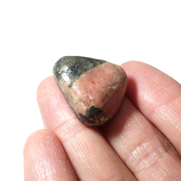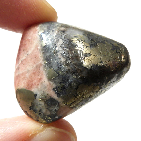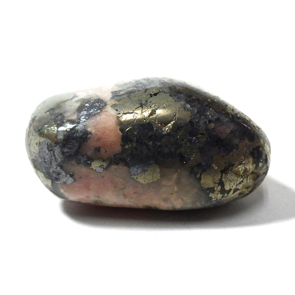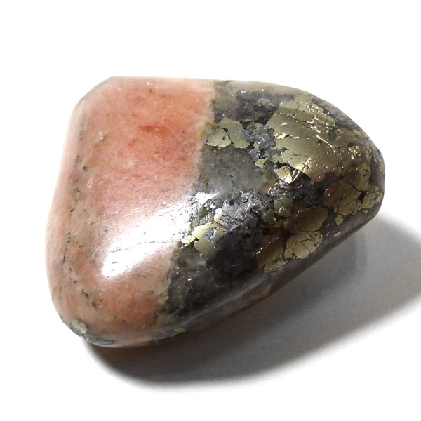 アメリカ産のトリプライトwithパイライト、タンブルです。主にトリプライトとパイライトが含まれる共生鉱物のタンブルになります。明るいサーモンピンクはトリプライト、光沢のある金色はパイライト(黄鉄鉱)です。トリプライトやパイライトと一緒に、ワグネライトと呼ばれる明るい茶色、暗い茶色、灰色の鉱物の小さな領域が見つかることもあります。トリプライトとしては透明度は低めですが、温かみのある色合いが魅力的で、インカローズと似た雰囲気を持っており、ゴールデンインカローズとも呼ばれたりもしております。ただ、ニックネームにインカローズとついていても、成分的にはまったく異なる鉱物です。トリプライトwithパイライトはスポット的に発見された非常に珍しい組み合わせの天然石です。