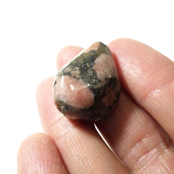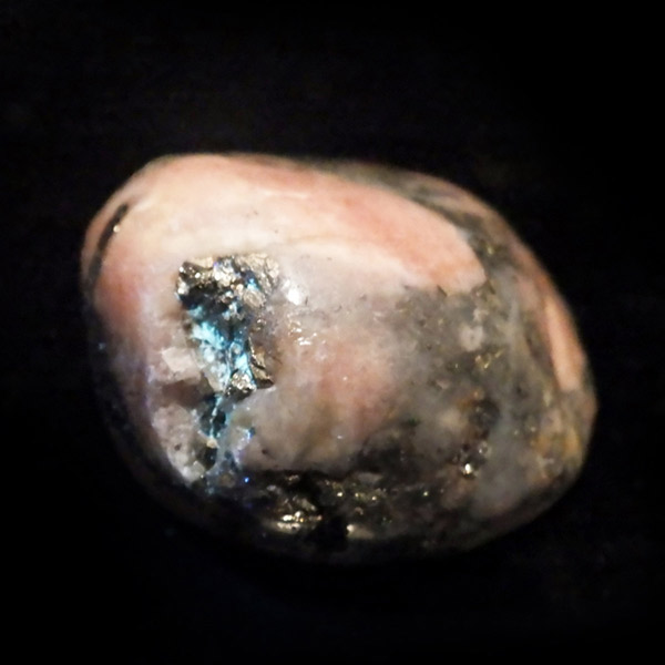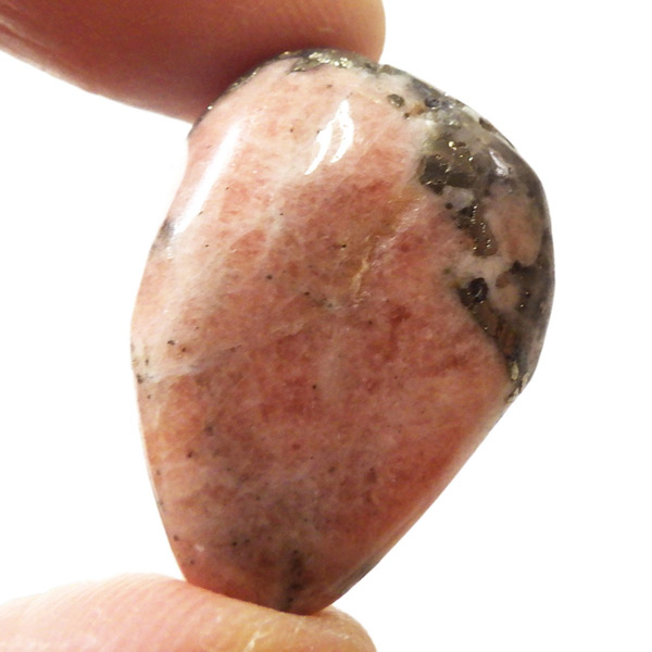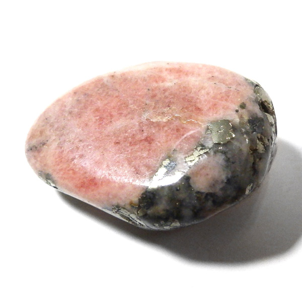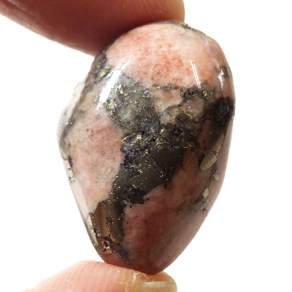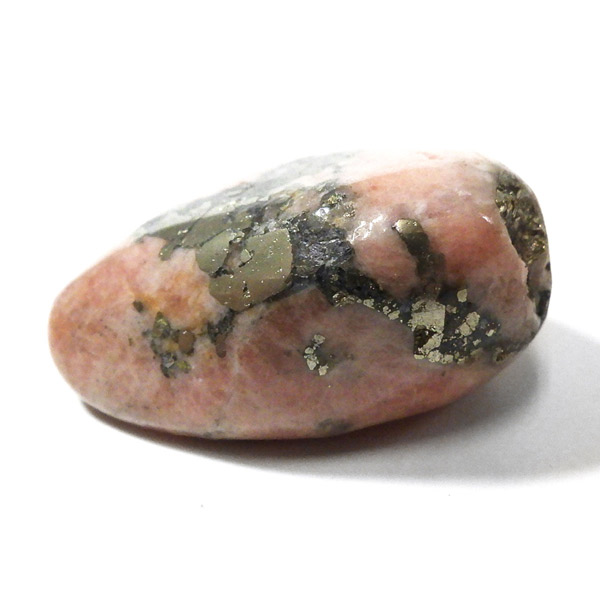 アメリカ産のトリプライトwithパイライト、タンブルです。主にトリプライトとパイライトが含まれる共生鉱物のタンブルになります。明るいサーモンピンクはトリプライト、光沢のある金色はパイライト(黄鉄鉱)です。トリプライトやパイライトと一緒に、ワグネライトと呼ばれる明るい茶色、暗い茶色、灰色の鉱物の小さな領域が見つかることもあります。トリプライトとしては透明度は低めですが、温かみのある色合いが魅力的で、インカローズと似た雰囲気を持っており、ゴールデンインカローズとも呼ばれたりもしております。ただ、ニックネームにインカローズとついていても、成分的にはまったく異なる鉱物です。トリプライトwithパイライトはスポット的に発見された非常に珍しい組み合わせの天然石です。