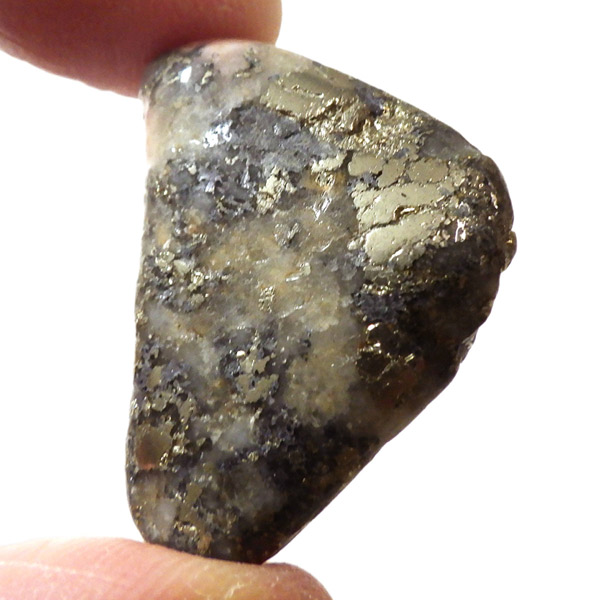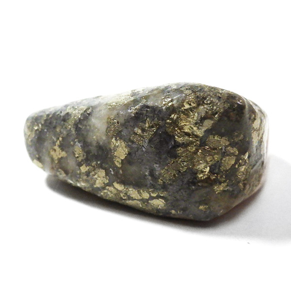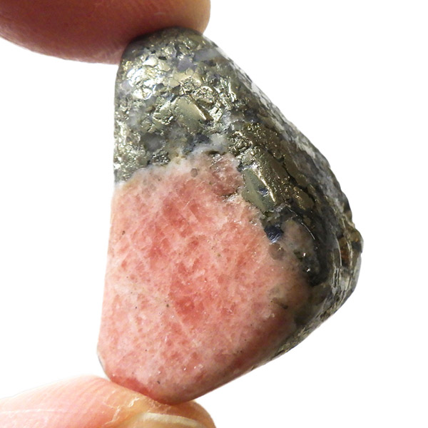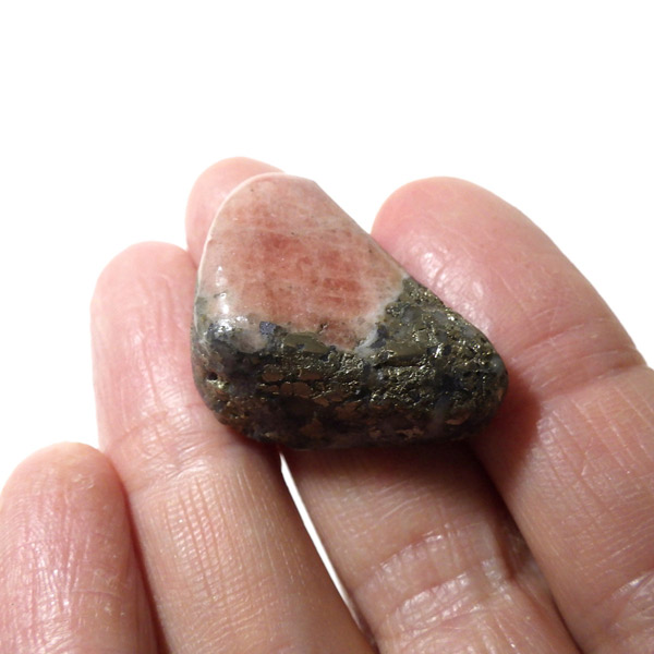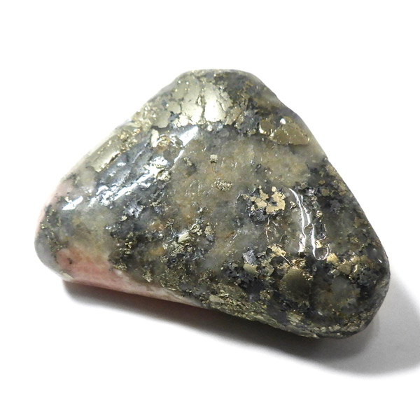 アメリカ産のトリプライトwithパイライト、タンブルです。主にトリプライトとパイライトが含まれる共生鉱物のタンブルになります。明るいサーモンピンクはトリプライト、光沢のある金色はパイライト(黄鉄鉱)です。トリプライトやパイライトと一緒に、ワグネライトと呼ばれる明るい茶色、暗い茶色、灰色の鉱物の小さな領域が見つかることもあります。トリプライトとしては透明度は低めですが、温かみのある色合いが魅力的で、インカローズと似た雰囲気を持っており、ゴールデンインカローズとも呼ばれたりもしております。ただ、ニックネームにインカローズとついていても、成分的にはまったく異なる鉱物です。トリプライトwithパイライトはスポット的に発見された非常に珍しい組み合わせの天然石です。