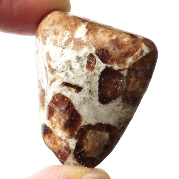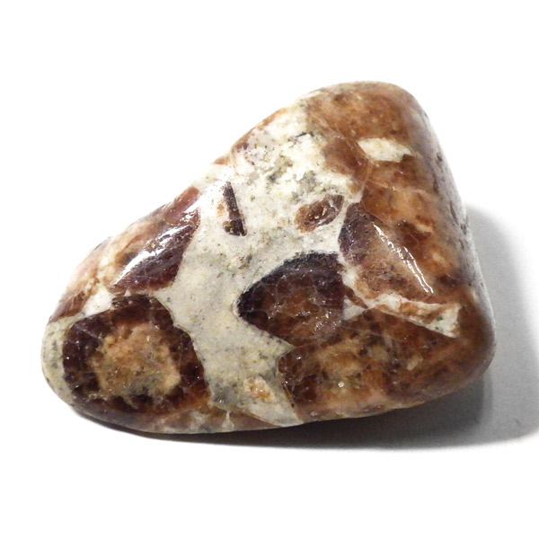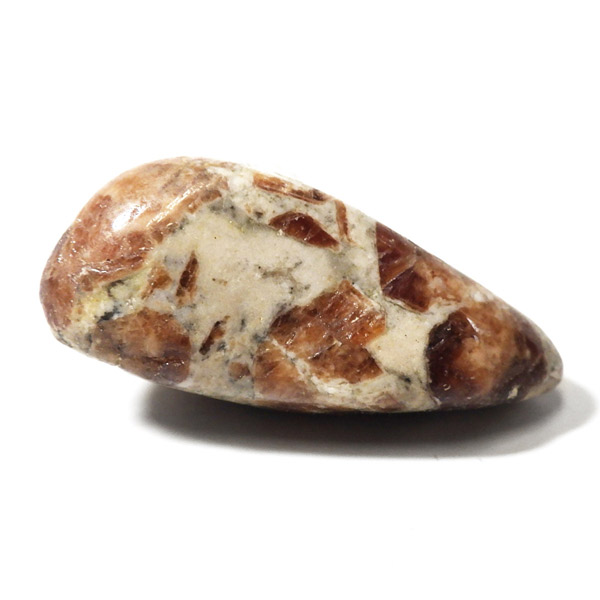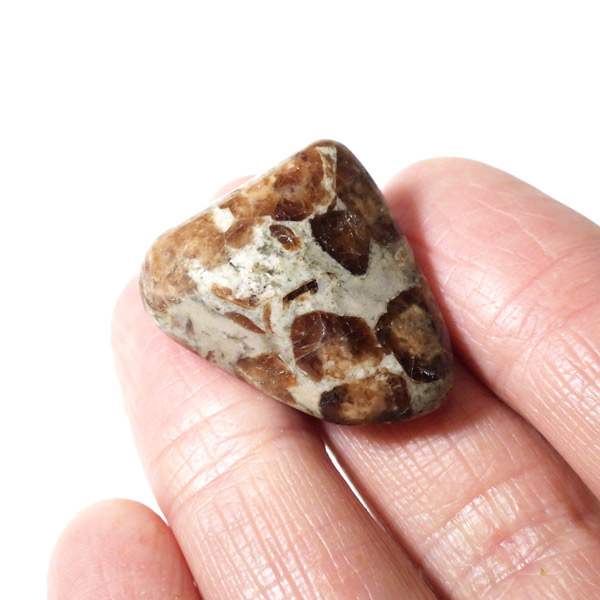 ナミビア産のガーネットインライムストーンのタンブルです。ガーネットインライムストーンは、情熱と安定を象徴するガーネットと、大地のエネルギーを感じさせるライムストーン(石灰岩)が絶妙に共生した、自然が生み出した美しいコンビネーションストーンです。 ガーネットの種類はグロシュラーガーネットといわれています。オレンジ系の褐色のガーネットが、温かみのあるベージュからグレーのライムストーンに点在し、その柄がドット模様が可愛らしいです。