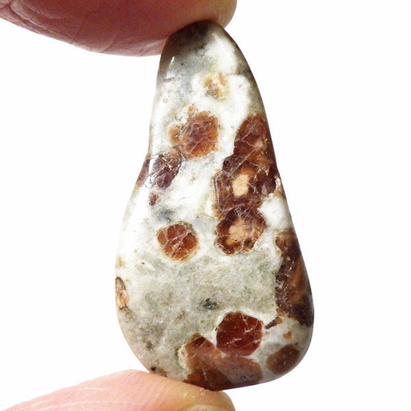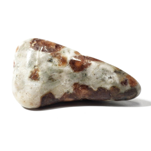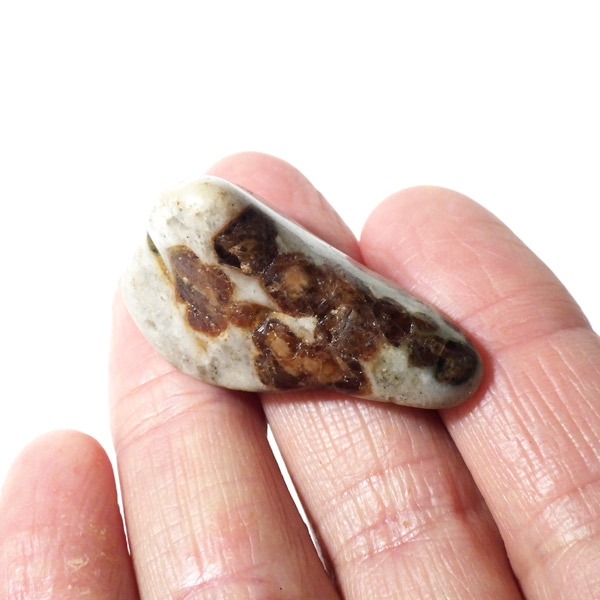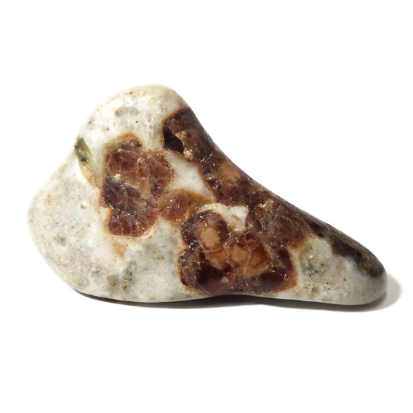ナミビア産のガーネットインライムストーンのタンブルです。ガーネットインライムストーンは、情熱と安定を象徴するガーネットと、大地のエネルギーを感じさせるライムストーン(石灰岩)が絶妙に共生した、自然が生み出した美しいコンビネーションストーンです。 ガーネットの種類はグロシュラーガーネットといわれています。オレンジ系の褐色のガーネットが、温かみのあるベージュからグレーのライムストーンに点在し、その柄がドット模様が可愛らしいです。