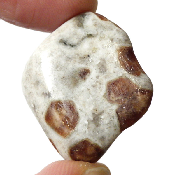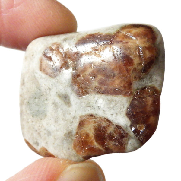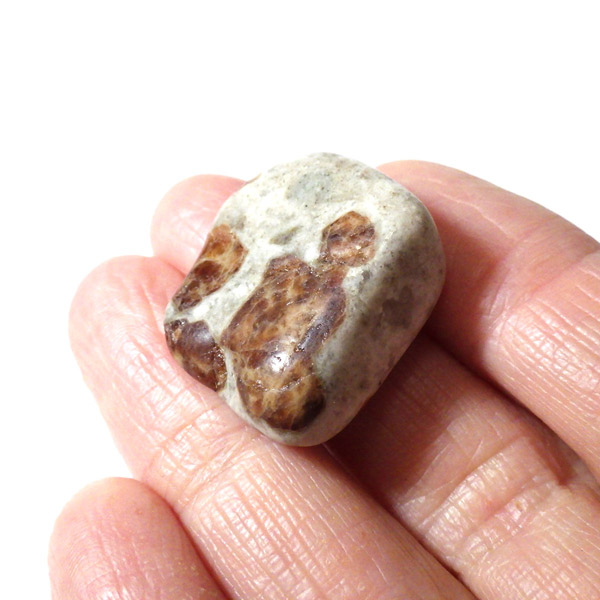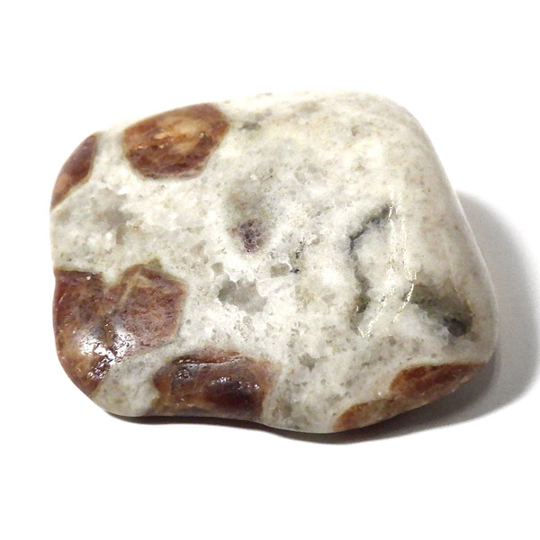 ナミビア産のガーネットインライムストーンのタンブルです。ガーネットインライムストーンは、情熱と安定を象徴するガーネットと、大地のエネルギーを感じさせるライムストーン(石灰岩)が絶妙に共生した、自然が生み出した美しいコンビネーションストーンです。 ガーネットの種類はグロシュラーガーネットといわれています。オレンジ系の褐色のガーネットが、温かみのあるベージュからグレーのライムストーンに点在し、その柄がドット模様が可愛らしいです。