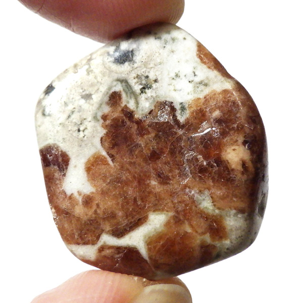 ガーネットの種類はグロシュラーガーネットといわれています。オレンジ系の褐色のガーネットが、温かみのあるベージュからグレーのライムストーンに点在し、その柄がドット模様が可愛らしいです。