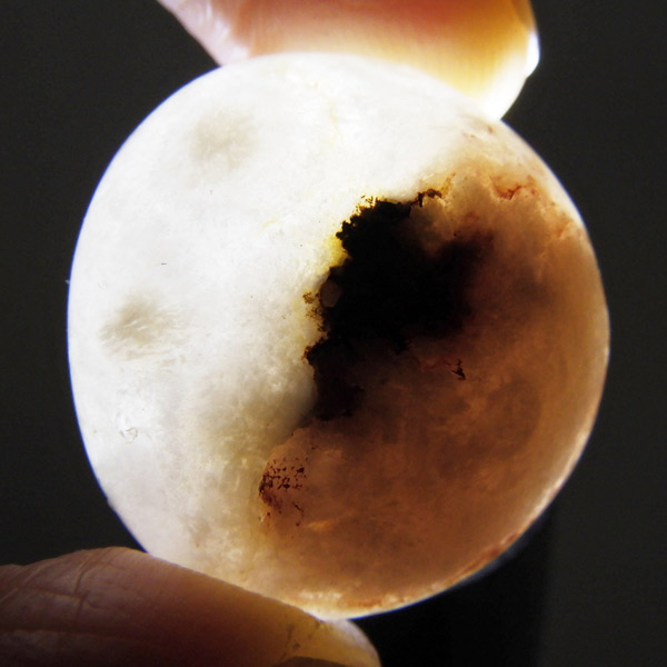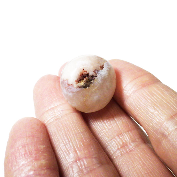 淡いピンクからオレンジ色の部分はカルセドニーで、近年流通し始めた新しい石種ですが、通常のめのうと異なり染色されていない天然の色味を持つものは非常に希少です。