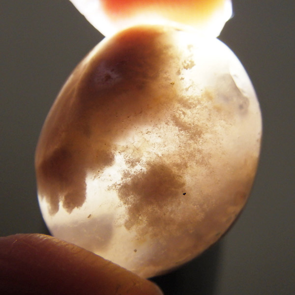 淡いピンクからオレンジ色の部分はカルセドニーで、近年流通し始めた新しい石種ですが、通常のめのうと異なり染色されていない天然の色味を持つものは非常に希少です。