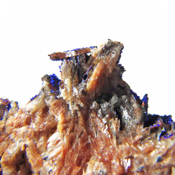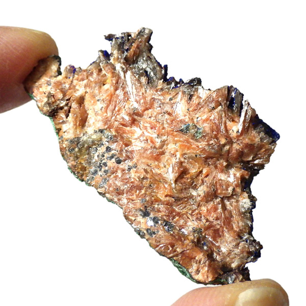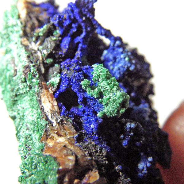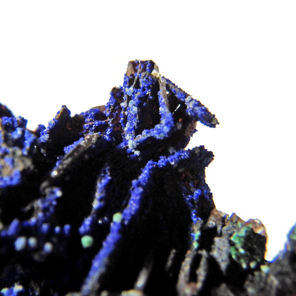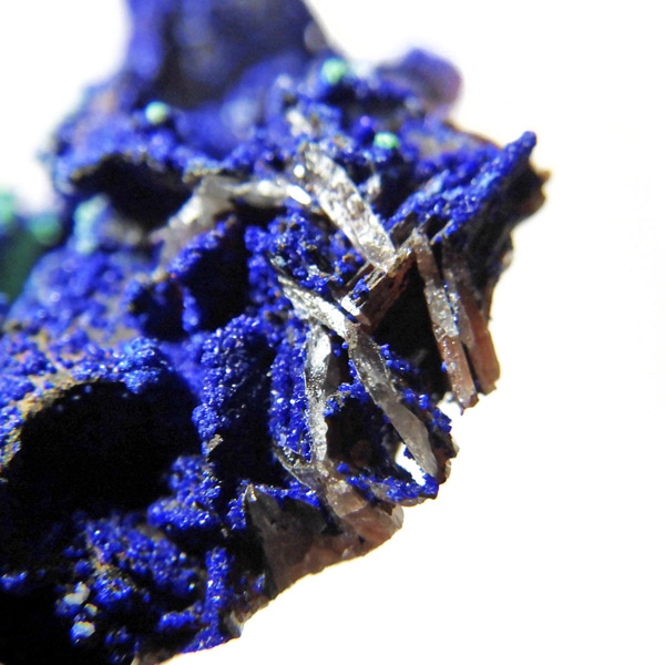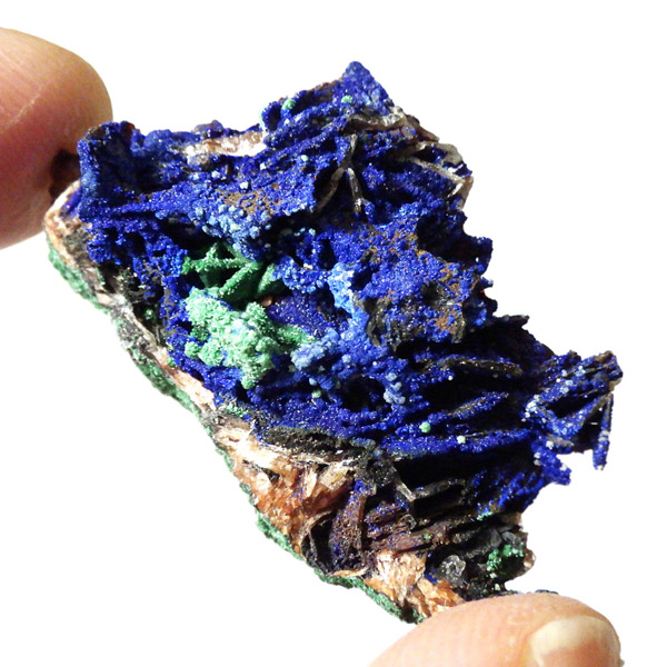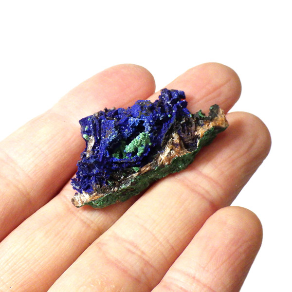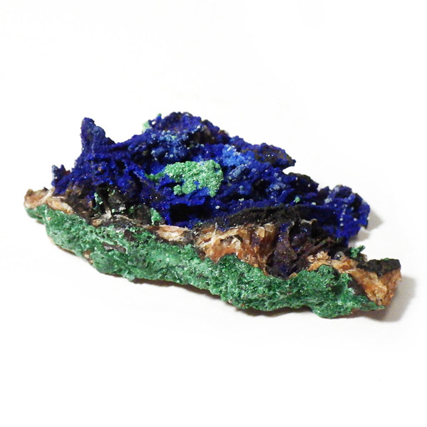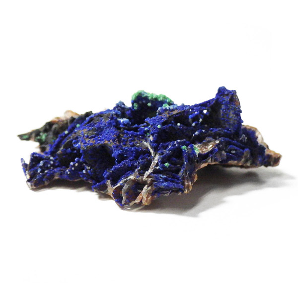 モロッコ産のアズライト結晶原石です。アズライトは産出量が少なく、鉱物コレクターの間でも非常に人気の高い希少石。中でもモロッコ産は、深く濃いブルーと美しい結晶構造を持つことで知られ、その美しさは世界トップクラスと評されています。バライト上にアズライトが結晶化されており、一部、鮮やかなグリーンのマラカイトとの共生も見られます。見る角度によってキラキラと表情を変える群青色の輝きは、まさに自然が生み出した芸術品です。