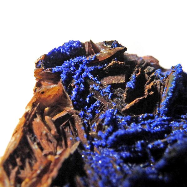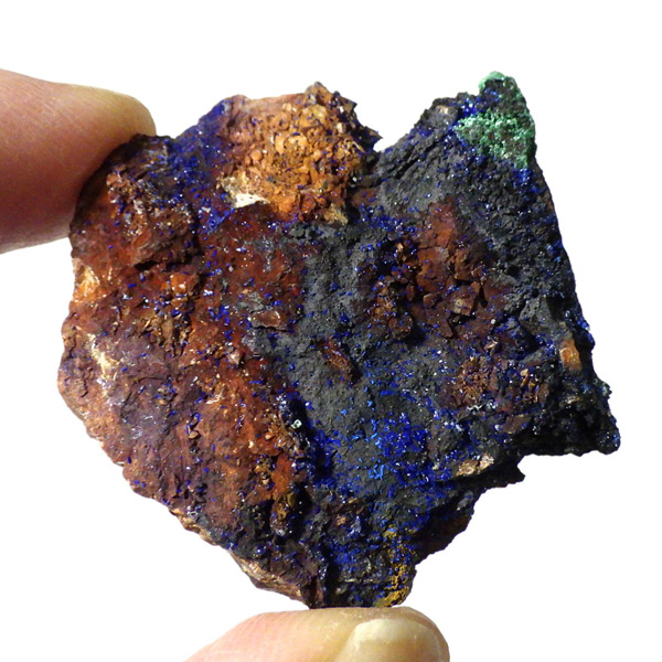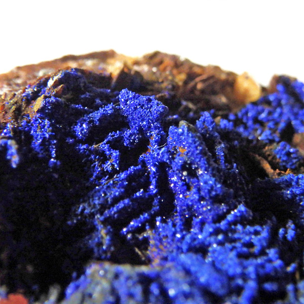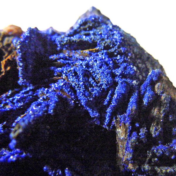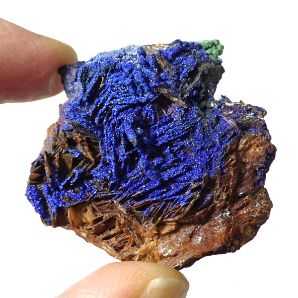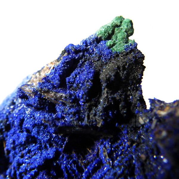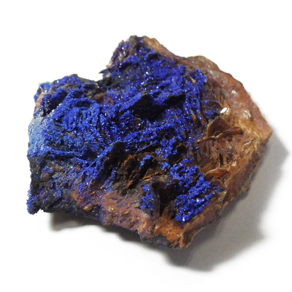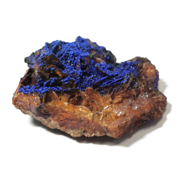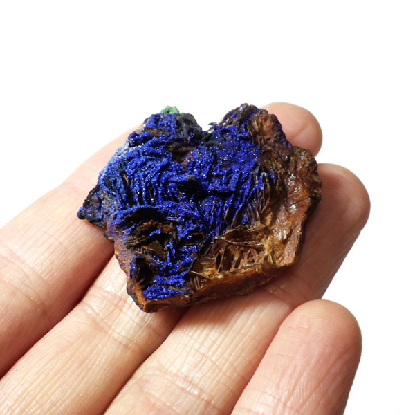 モロッコ産のアズライト結晶原石です。アズライトは産出量が少なく、鉱物コレクターの間でも非常に人気の高い希少石。中でもモロッコ産は、深く濃いブルーと美しい結晶構造を持つことで知られ、その美しさは世界トップクラスと評されています。バライト上にアズライトが結晶化されており、一部、鮮やかなグリーンのマラカイトとの共生も見られます。見る角度によってキラキラと表情を変える群青色の輝きは、まさに自然が生み出した芸術品です。