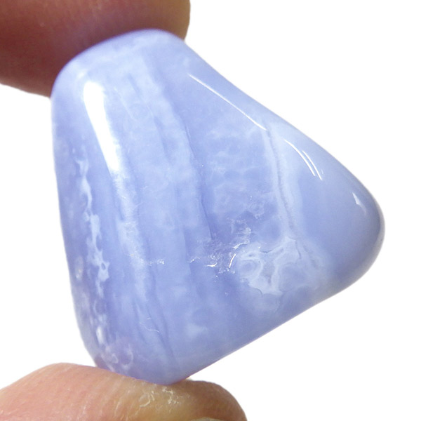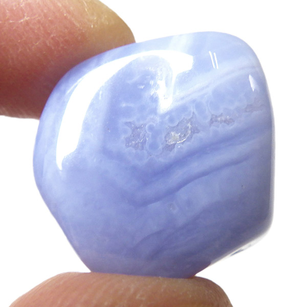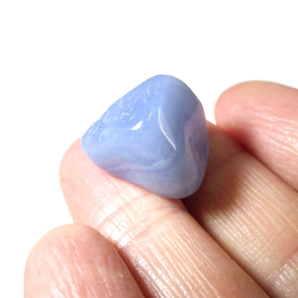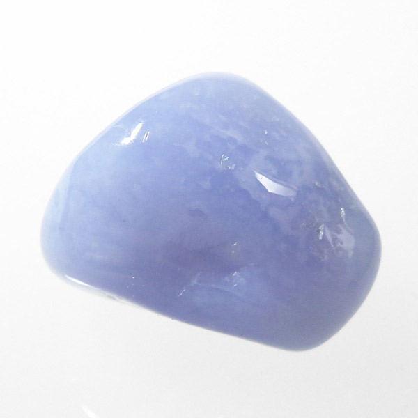 トルコ産のブルーカルセドニー、タンブルです。カルセドニーはアゲートとよく似ており、いろいろな色が混ざっており、模様があるものがアゲート、色が均一で模様がないものがカルセドニー分類されています。カルセドニーのグループにはカーネリアンやクリソプレーズなど鮮やかな石があるのは有名です。こちらのブルーカルセドニーは落ち着いたブルーの天然の発色で、光に透かした透過光は赤みを帯びたミルキーな色味があります。カルセドニーの産地でも白っぽいライトなブルーカルセドニーなども多く、ブルーカルセドニーの中でも発色が良く、高品質なタンブルです。