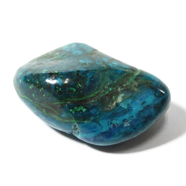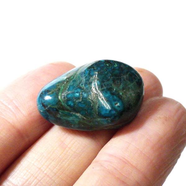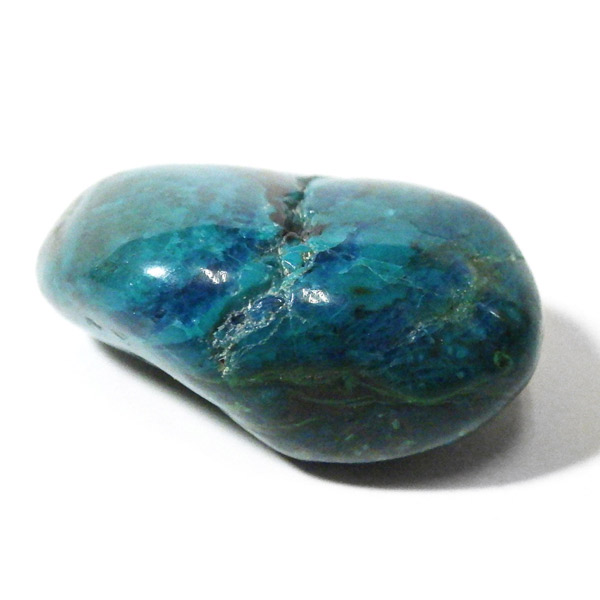 ペルー産のクリソコラ、タンブルです。 クリソコラは珪酸塩鉱物に分類されることから、和名で「珪孔雀石(けいくじゃくせき)」と呼ばれています。主に銅を含む鉱床の二次酸化帯で形成され、マラカイト(孔雀石)やアズライト(藍銅鉱)、クォーツ(石英)などと共生することが多い鉱物です。ペルー産のクリソコラは、明るく鮮やかなグリーンブルー?ターコイズブルーが特徴で、銅鉱床の豊富な地域ならではの発色を見せます。その美しい色合いから、古代エジプトやアステカでも装飾品や護符として愛用されてきたと伝えられています。