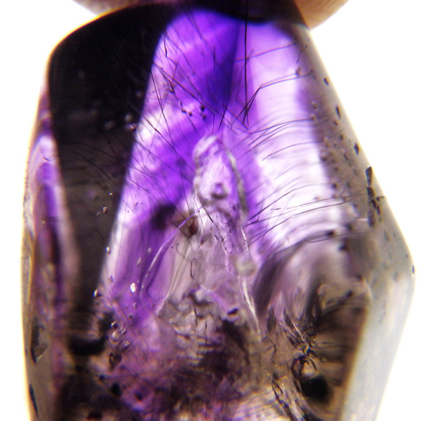 透明なクォーツの中に、煙のようにふわりと漂う美しいパープルのアメジストと、黒みを帯びたスモーキークォーツが共存しています。