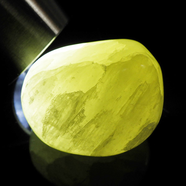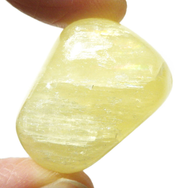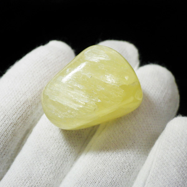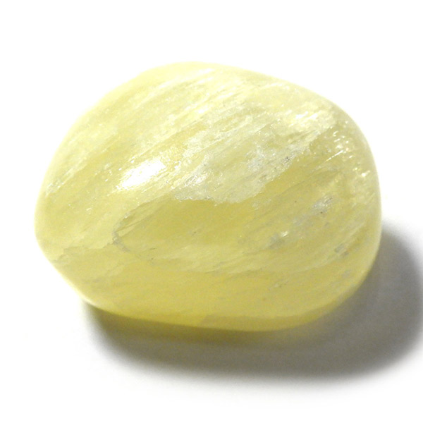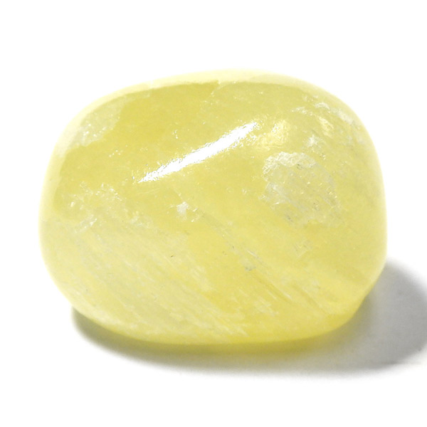 アフガニスタン産、イエローカルサイトのタンブルです。カルサイトはイエロー以外にもグリーン、ピンク、オレンジ、ブルーなどと含まれる成分により様々なカラーバリエーションがあります。純粋なカルサイトは無色ですが、鉄分が含まれることで黄色になります。その見た目からパイナップルカルサイトとも呼ばれています。オレンジでもグリーンでもない、パイナップルカラーのイエローと白い筋がまさパイナップルの果肉にそっくりですね。フラッシュライトなどで光を通してもきれいです。