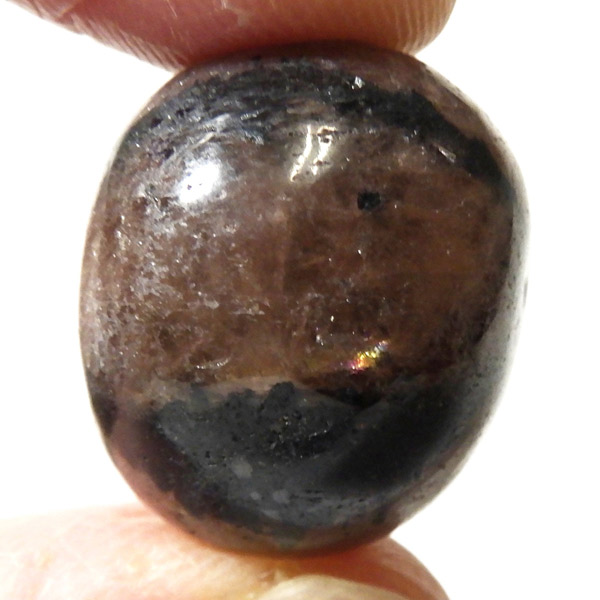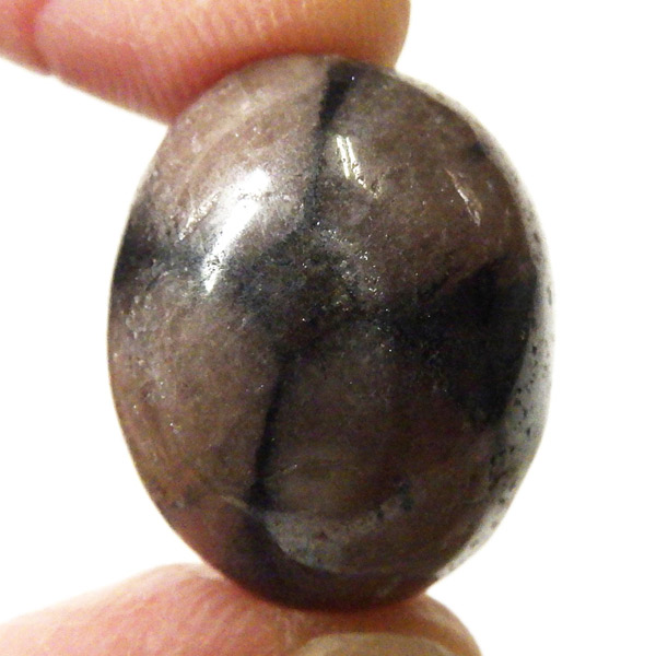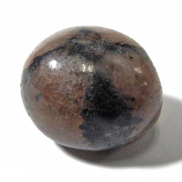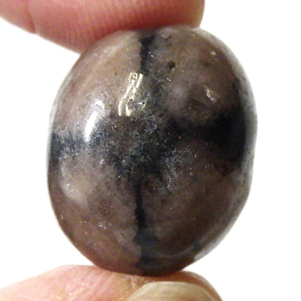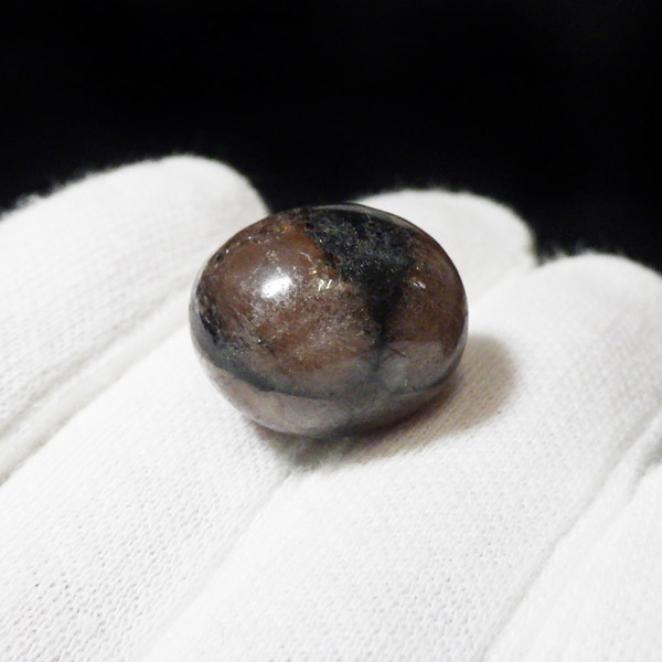 スペイン産、キャストライトタンブルです。濃いブラウンに黒の十字模様が大変魅力的な石です。 キャストライトの名前は、輪切りにすると黒い十字の模様が現れることから、ギリシャ語で「対角線的な配列」という意味の「Chiastos」に由来しています。 キャストライトは、黒鉛(グラファイト)などの黒色含有物を対称的に含んだ紅柱石です。クロスストーンとも呼ばれ、粘板岩と花こう岩の接触部に産出します。黒の十字が目を引く一方、茶色のサイド面の結晶がキラキラと美しく見えるのも魅力的です。
