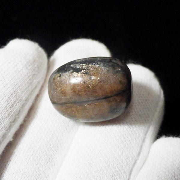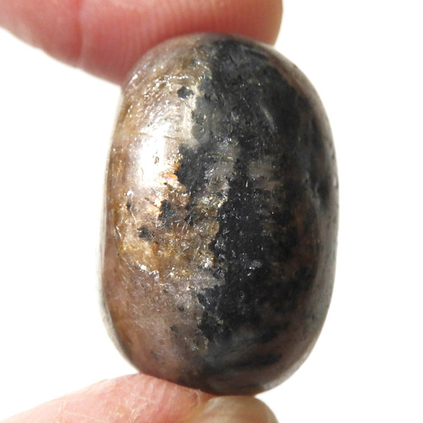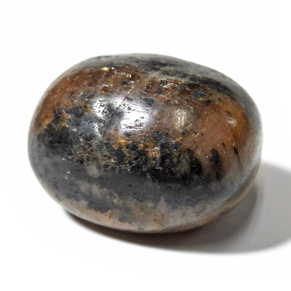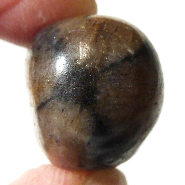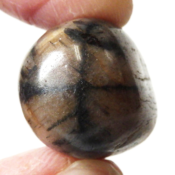 スペイン産、キャストライトタンブルです。濃いブラウンに黒の十字模様が大変魅力的な石です。 キャストライトの名前は、輪切りにすると黒い十字の模様が現れることから、ギリシャ語で「対角線的な配列」という意味の「Chiastos」に由来しています。 キャストライトは、黒鉛(グラファイト)などの黒色含有物を対称的に含んだ紅柱石です。クロスストーンとも呼ばれ、粘板岩と花こう岩の接触部に産出します。黒の十字が目を引く一方、茶色のサイド面の結晶がキラキラと美しく見えるのも魅力的です。