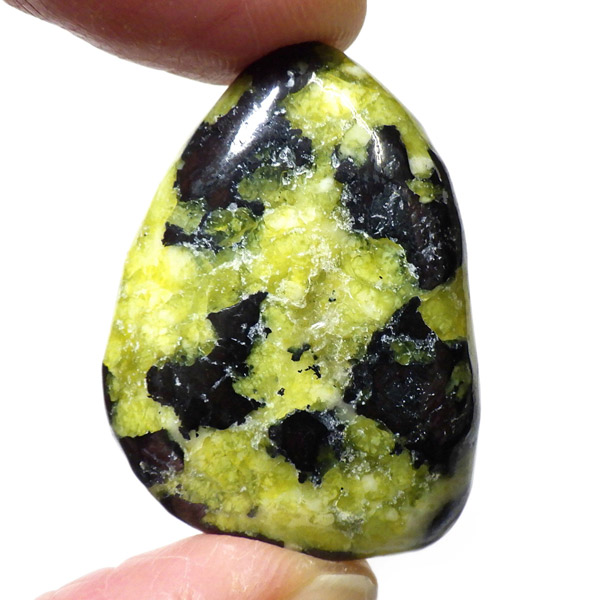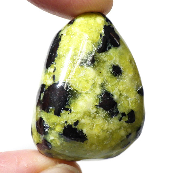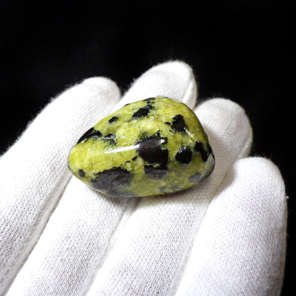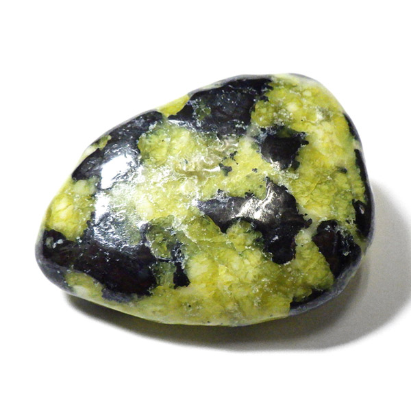 ノルウェー産のリザーダイト、タンブルです。リザーダイトは、サーペンティンの一種です。日本では黄色であるところから「きなこ石」と呼ばれていたりもする、非常に微細な板状の塊が特徴の鉱物です。