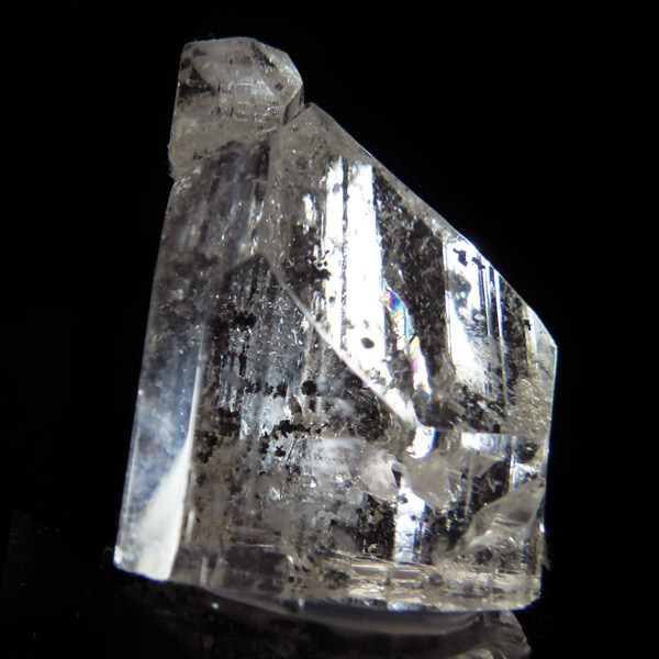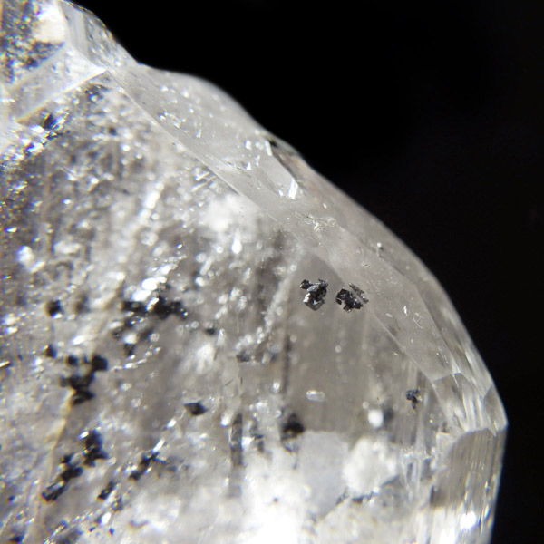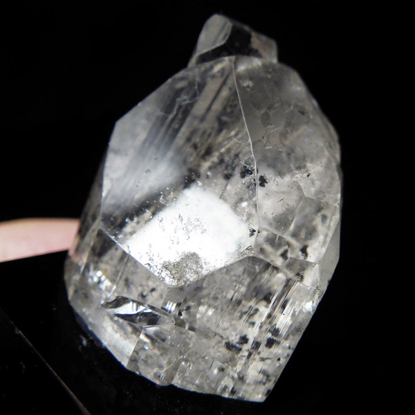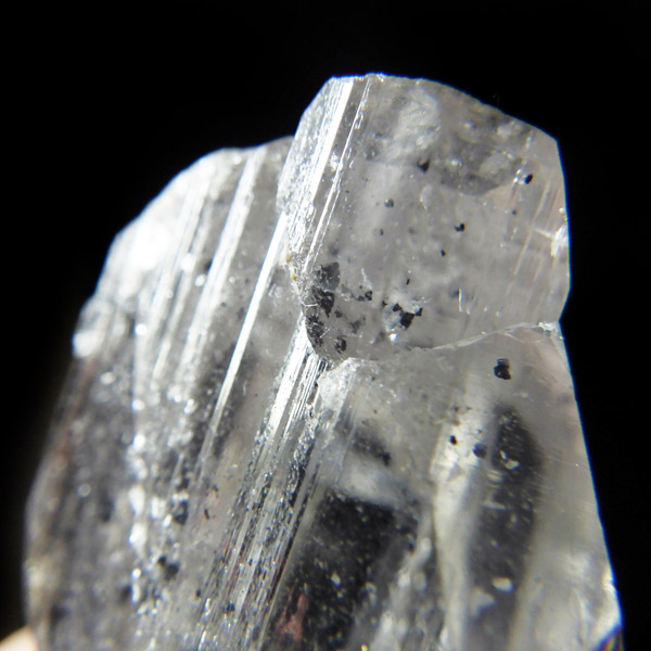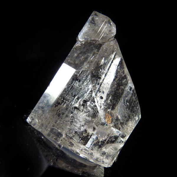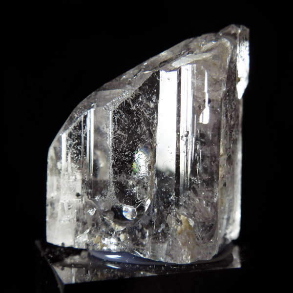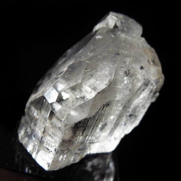 本品は、澄み渡るようなクリアな透明感を持ち、柱状結晶の表面に見られる細かな条線(ストリエーション)が大変美しい一点です。主晶の周囲には小さなトパーズ結晶が共生しており、天然結晶ならではの趣深い造形をお楽しみいただけます。また内部にはグラファイト(黒鉛)が内包されており、透明な結晶の中に浮かぶ黒のアクセントが、より一層その魅力を引き立てています。