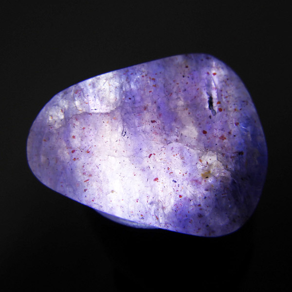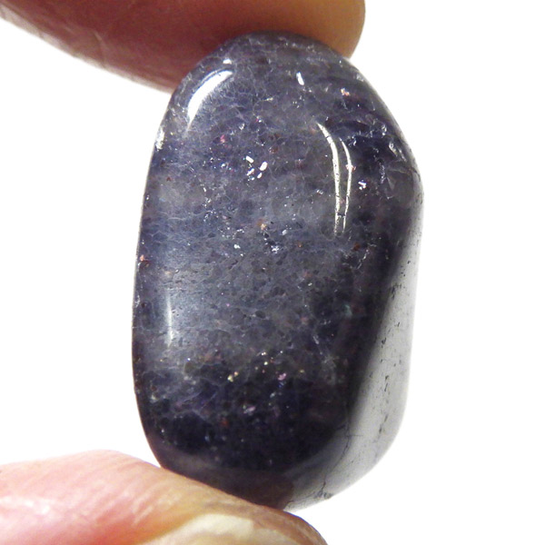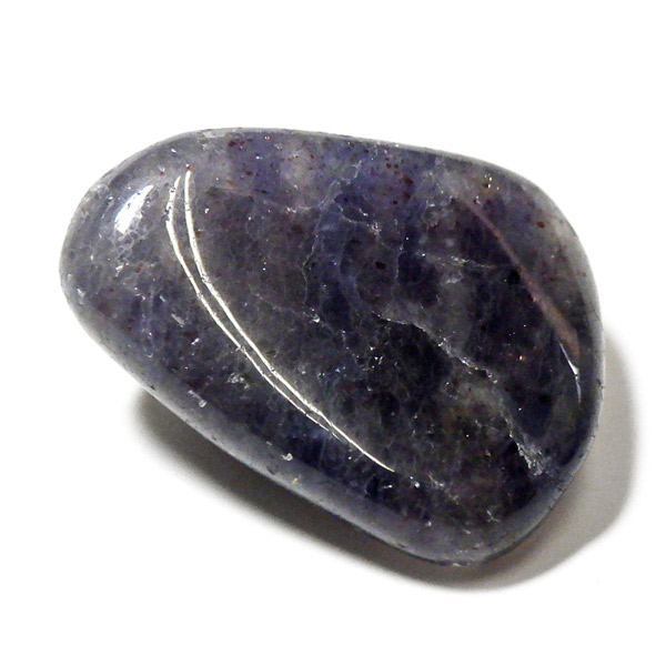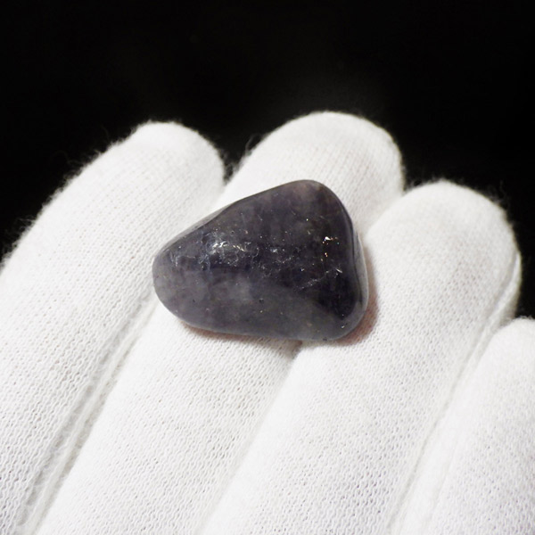 インド産のアイオライト、タンブルです。アイオライトは見る角度によって色が変化するという神秘的な鉱石です。広域変成岩や接触変成岩などで発見されるケイ酸塩鉱物の一種で、多色性が強く、見る角度によって群青色から淡い枯れ草色に変化します。透明度こそ高くはありませんが、光に透かすとブラッドショットと呼ばれる赤い斑点が見られるブラッドショットアイオライトとも呼ばれています。またサンストーンのようなキラキラとしたアベンチュレッセンスも見られます。