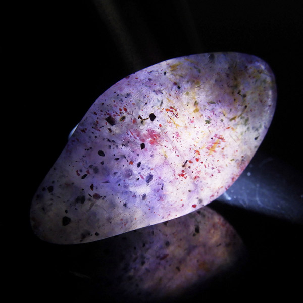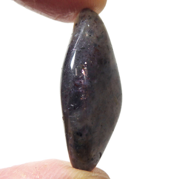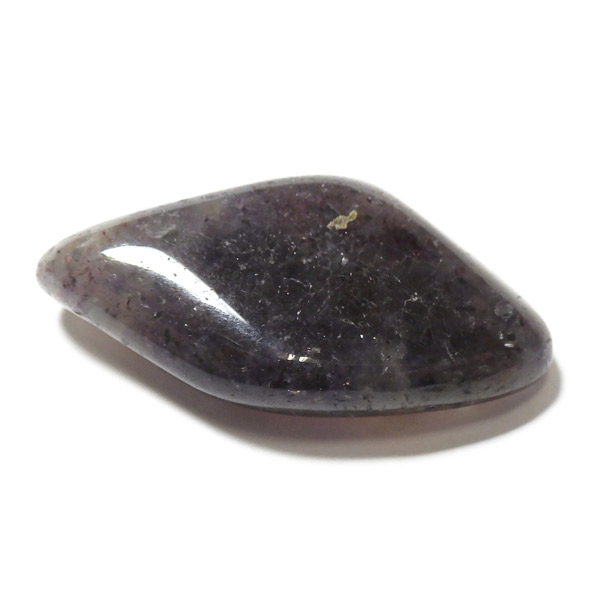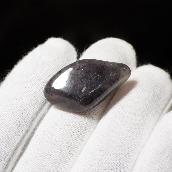 インド産のアイオライト、タンブルです。アイオライトは見る角度によって色が変化するという神秘的な鉱石です。広域変成岩や接触変成岩などで発見されるケイ酸塩鉱物の一種で、多色性が強く、見る角度によって群青色から淡い枯れ草色に変化します。透明度こそ高くはありませんが、光に透かすとブラッドショットと呼ばれる赤い斑点が見られるブラッドショットアイオライトとも呼ばれています。またサンストーンのようなキラキラとしたアベンチュレッセンスも見られます。