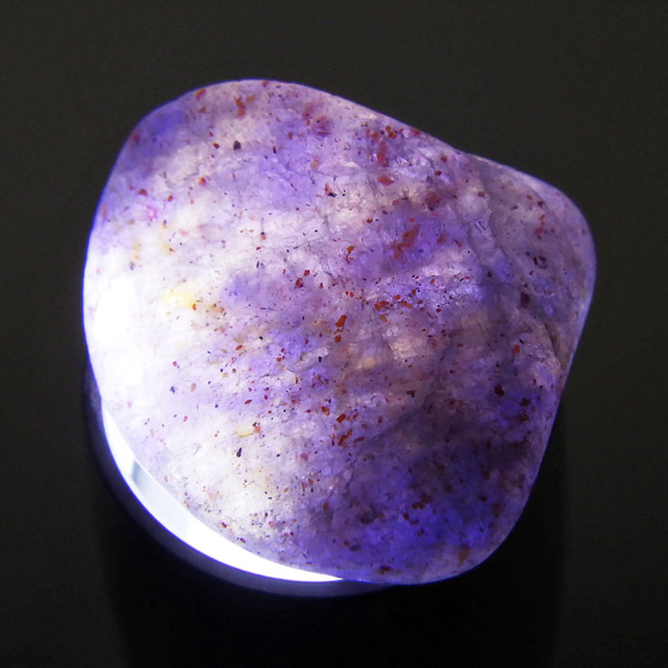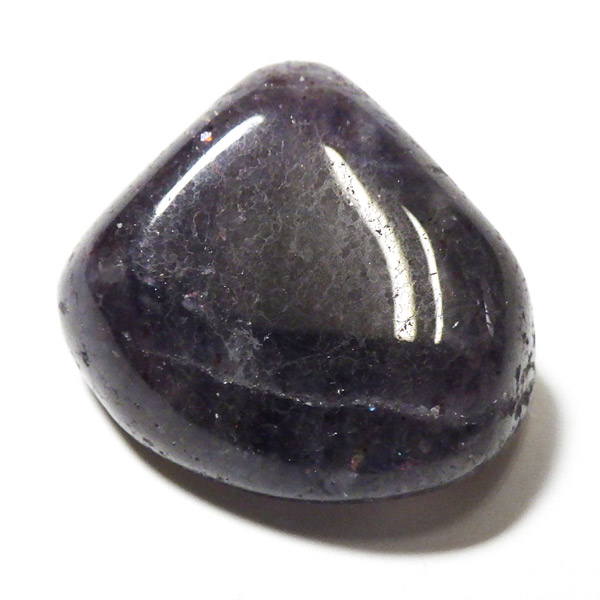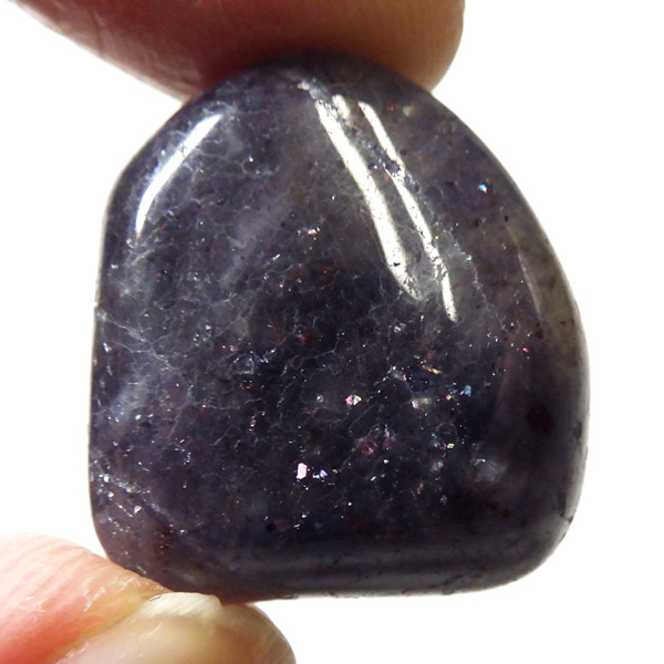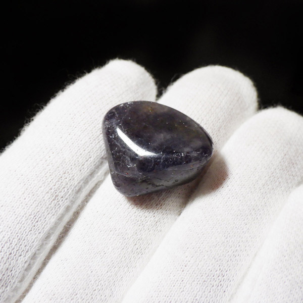 インド産のアイオライト、タンブルです。アイオライトは見る角度によって色が変化するという神秘的な鉱石です。広域変成岩や接触変成岩などで発見されるケイ酸塩鉱物の一種で、多色性が強く、見る角度によって群青色から淡い枯れ草色に変化します。透明度こそ高くはありませんが、光に透かすとブラッドショットと呼ばれる赤い斑点が見られるブラッドショットアイオライトとも呼ばれています。またサンストーンのようなキラキラとしたアベンチュレッセンスも見られます。
