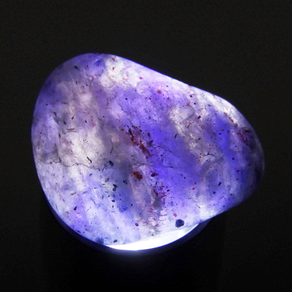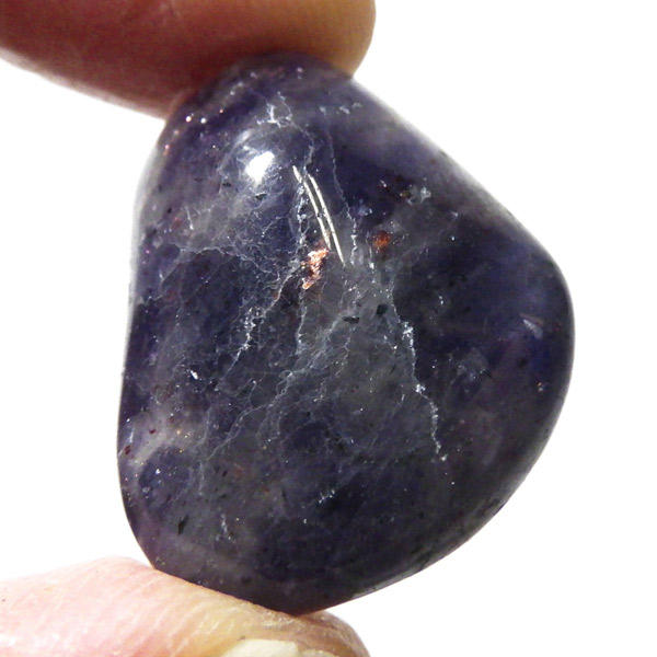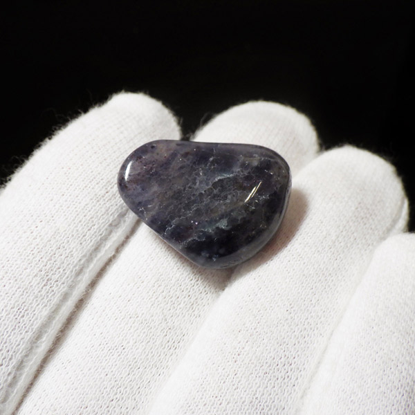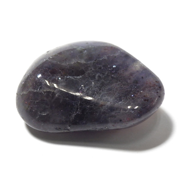 インド産のアイオライト、タンブルです。アイオライトは見る角度によって色が変化するという神秘的な鉱石です。広域変成岩や接触変成岩などで発見されるケイ酸塩鉱物の一種で、多色性が強く、見る角度によって群青色から淡い枯れ草色に変化します。透明度こそ高くはありませんが、光に透かすとブラッドショットと呼ばれる赤い斑点が見られるブラッドショットアイオライトとも呼ばれています。またサンストーンのようなキラキラとしたアベンチュレッセンスも見られます。