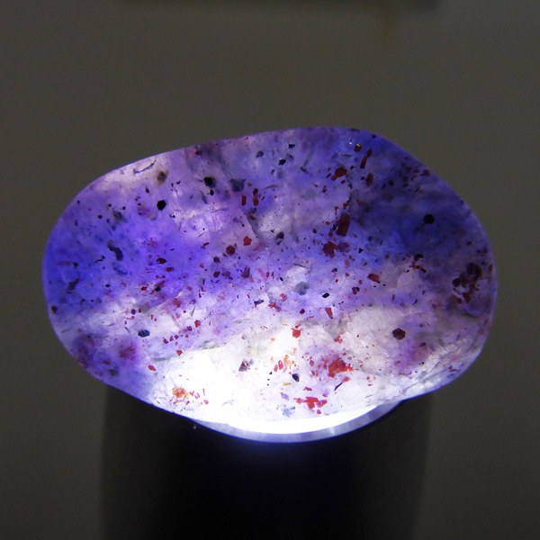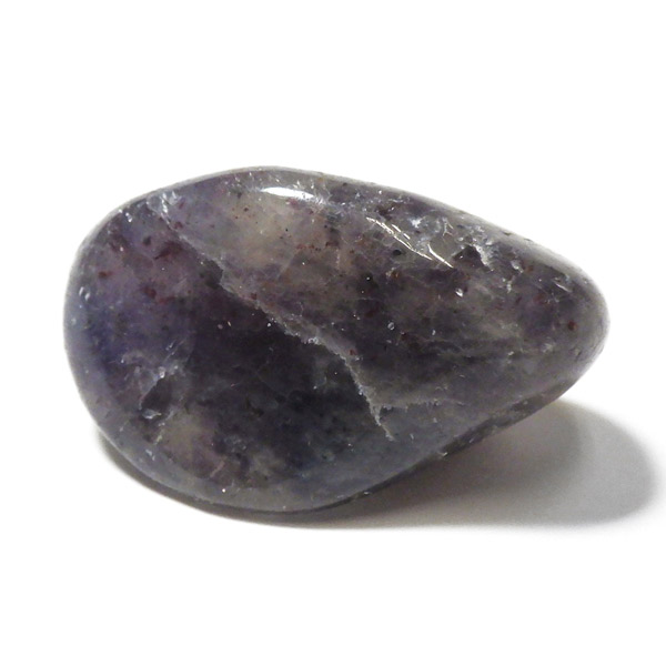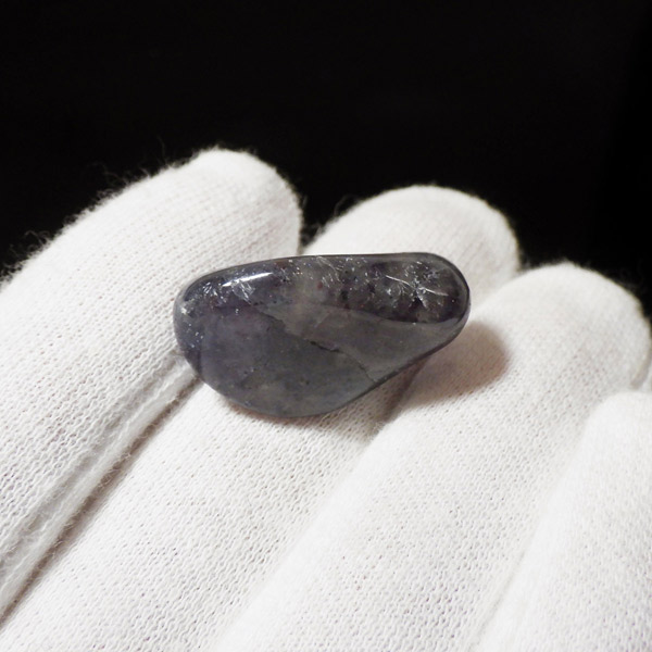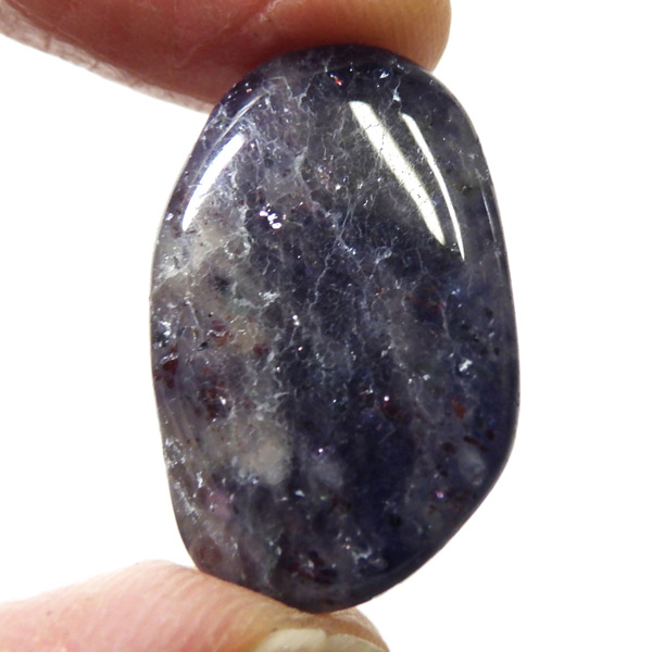 インド産のアイオライト、タンブルです。アイオライトは見る角度によって色が変化するという神秘的な鉱石です。広域変成岩や接触変成岩などで発見されるケイ酸塩鉱物の一種で、多色性が強く、見る角度によって群青色から淡い枯れ草色に変化します。透明度こそ高くはありませんが、光に透かすとブラッドショットと呼ばれる赤い斑点が見られるブラッドショットアイオライトとも呼ばれています。またサンストーンのようなキラキラとしたアベンチュレッセンスも見られます。