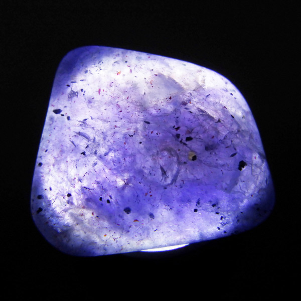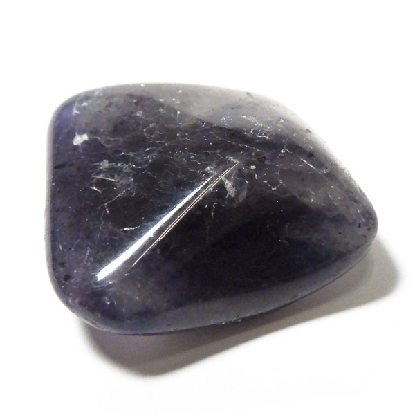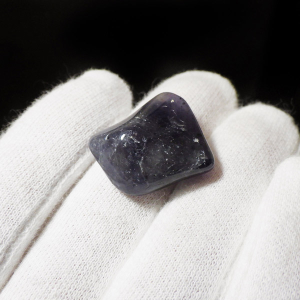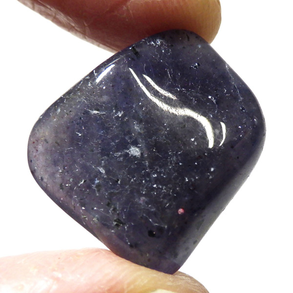 インド産のアイオライト、タンブルです。アイオライトは見る角度によって色が変化するという神秘的な鉱石です。広域変成岩や接触変成岩などで発見されるケイ酸塩鉱物の一種で、多色性が強く、見る角度によって群青色から淡い枯れ草色に変化します。透明度こそ高くはありませんが、光に透かすとブラッドショットと呼ばれる赤い斑点が見られるブラッドショットアイオライトとも呼ばれています。またサンストーンのようなキラキラとしたアベンチュレッセンスも見られます。