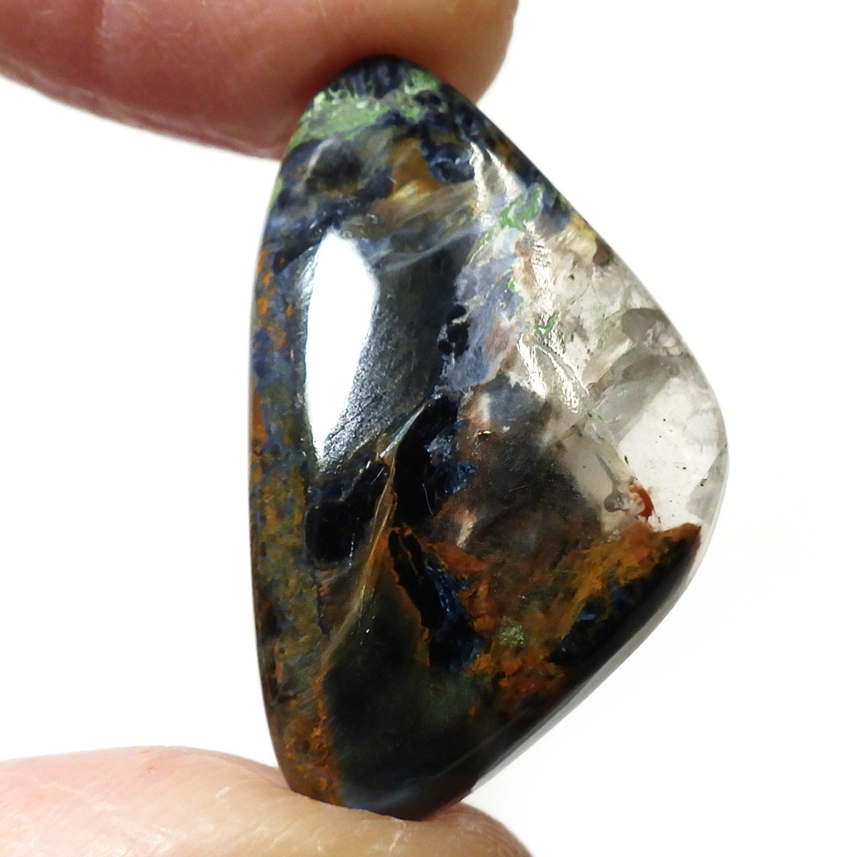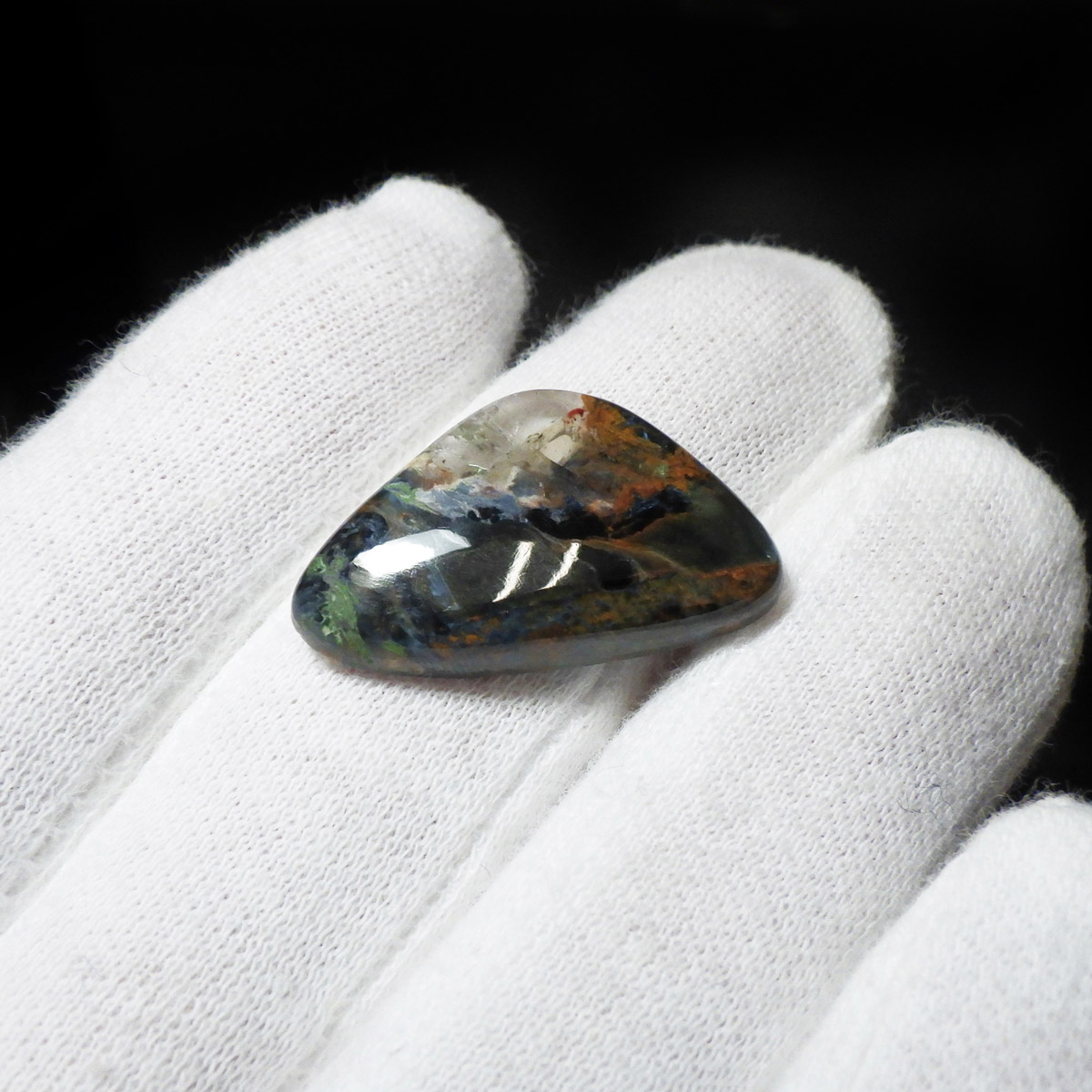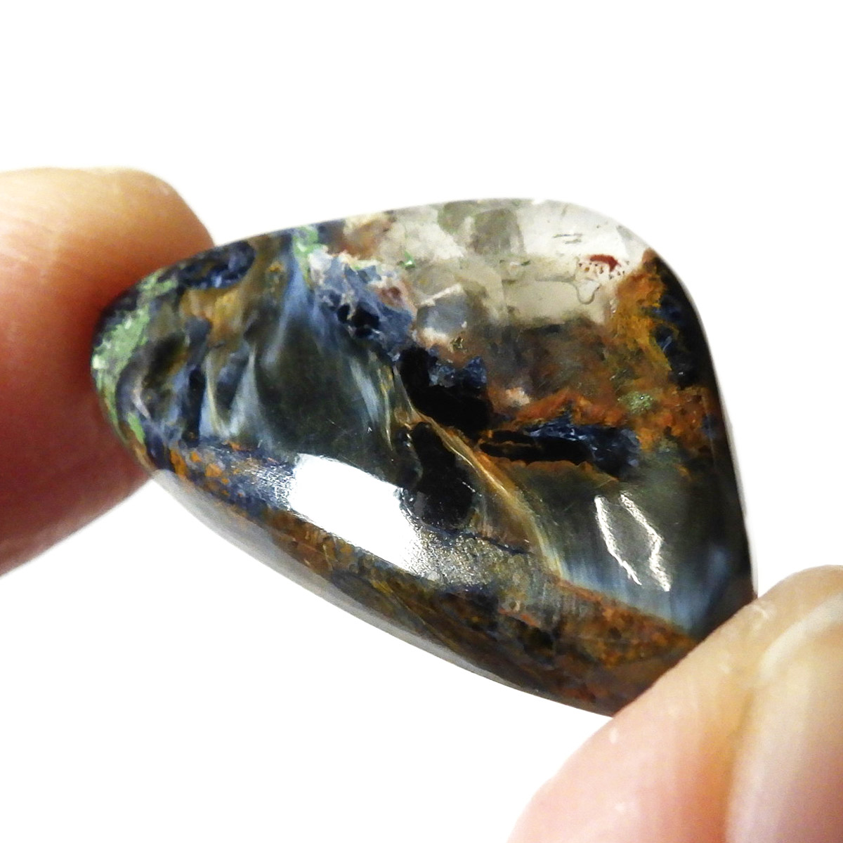 ナミビア産ブルーピーターサイトのルースです。タイガーアイの成分を持つ鉱物が、地殻変動によって粉砕され、膨大な年月を掛けて石英により自然に接合されて出来た鉱物です。そのため、タイガーアイのように繊維が直線状に形成されず、油絵のような独特のうねりのある模様になります。名称は「シド・ピーターズ」によってナミビアで初めて発見されたため、発見者にちなんで「ピーターサイト」と命名されました。独特の色模様が、嵐のようにも見えることから、別名「テンペストストーン(嵐の石)」とも呼ばれることが有ります。鉱物学的名正式名称はクロシドライトアゲートとなります。