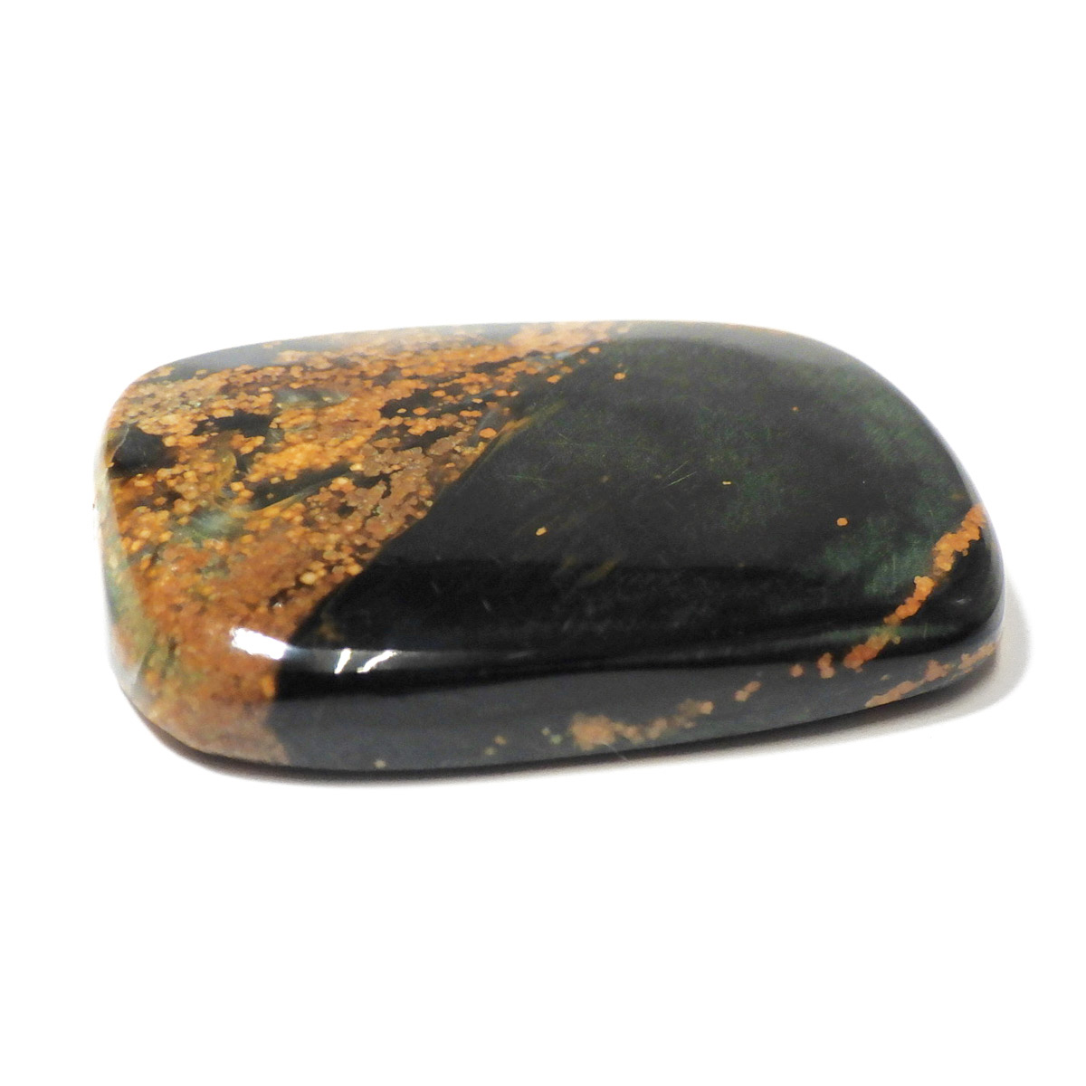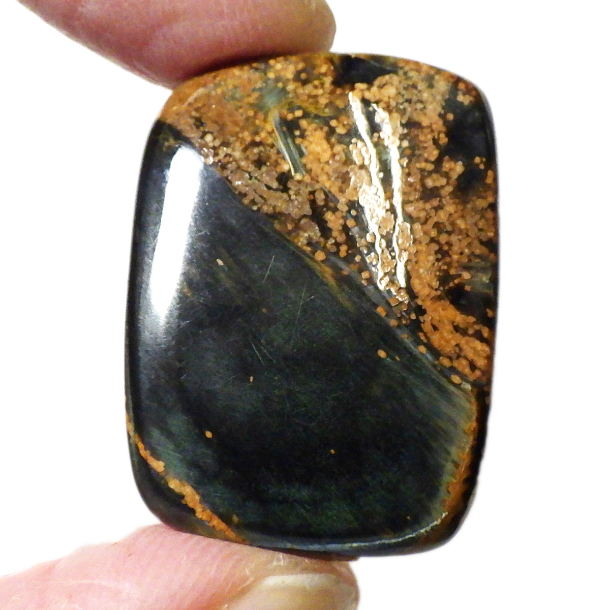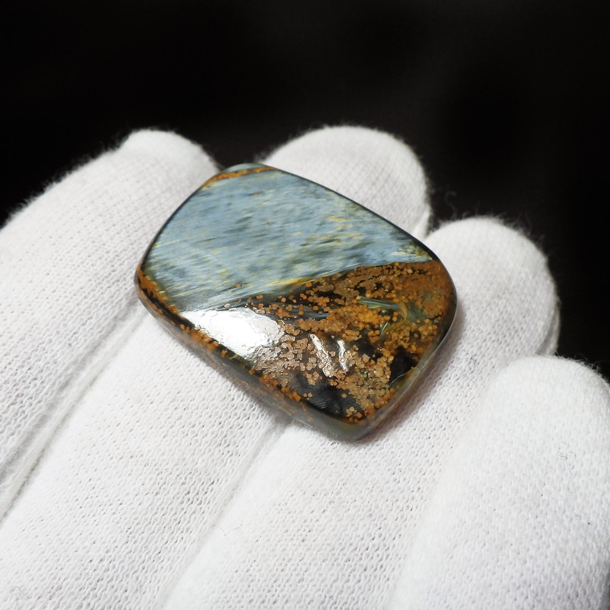 ナミビア産ブルーピーターサイトのルースです。タイガーアイの成分を持つ鉱物が、地殻変動によって粉砕され、膨大な年月を掛けて石英により自然に接合されて出来た鉱物です。そのため、タイガーアイのように繊維が直線状に形成されず、油絵のような独特のうねりのある模様になります。名称は「シド・ピーターズ」によってナミビアで初めて発見されたため、発見者にちなんで「ピーターサイト」と命名されました。独特の色模様が、嵐のようにも見えることから、別名「テンペストストーン(嵐の石)」とも呼ばれることが有ります。鉱物学的名正式名称はクロシドライトアゲートとなります。