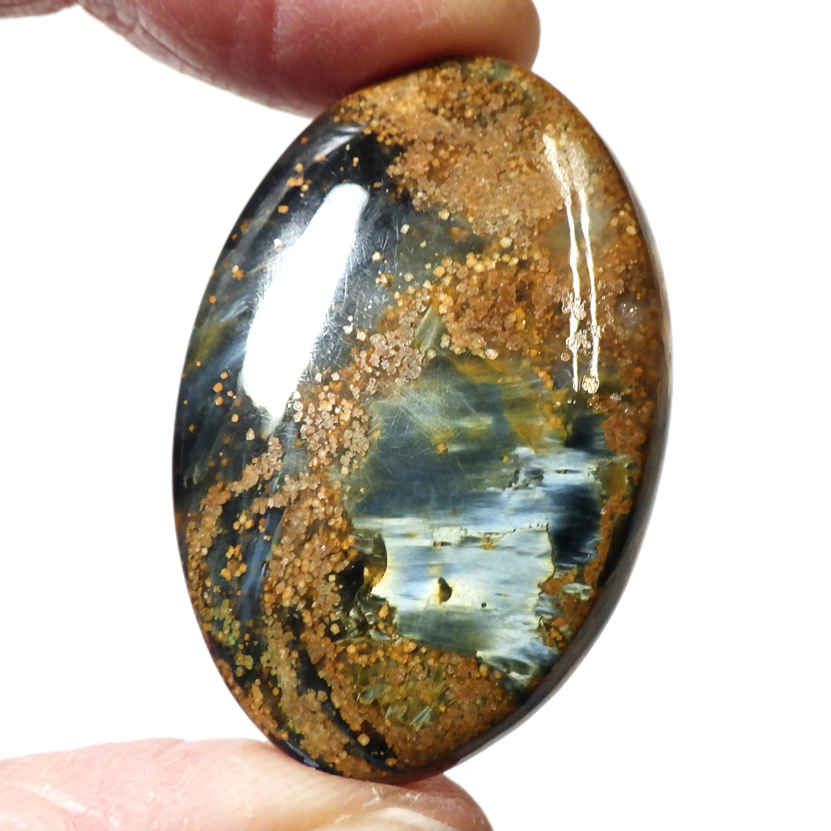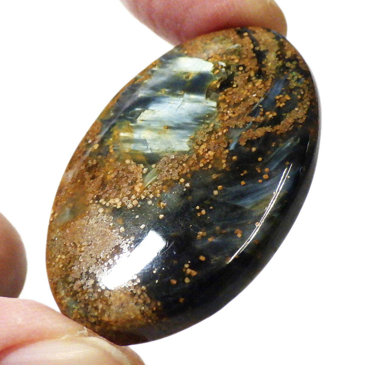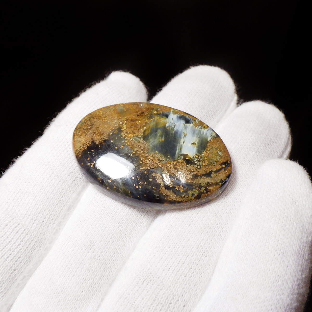 ナミビア産ブルーピーターサイトのルースです。タイガーアイの成分を持つ鉱物が、地殻変動によって粉砕され、膨大な年月を掛けて石英により自然に接合されて出来た鉱物です。そのため、タイガーアイのように繊維が直線状に形成されず、油絵のような独特のうねりのある模様になります。名称は「シド・ピーターズ」によってナミビアで初めて発見されたため、発見者にちなんで「ピーターサイト」と命名されました。独特の色模様が、嵐のようにも見えることから、別名「テンペストストーン(嵐の石)」とも呼ばれることが有ります。鉱物学的名正式名称はクロシドライトアゲートとなります。