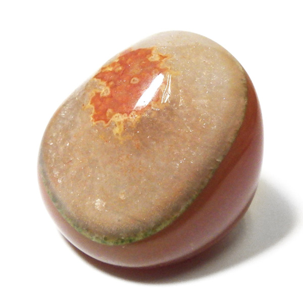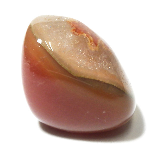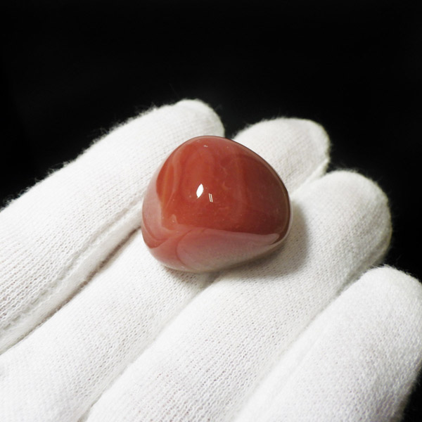 チャイナ産のレッドアゲート、タンブルです。和名は赤瑪瑙。カラー・縞模様が綺麗に現れたレッドアゲートです。カルセドニーの縞模様の部分とクォーツ部分がはっきりと見られるのでレッドアゲートにしております。人によってはサードオニキスと呼ぶかもしれません。レッドアゲートの赤は赤鉄鉱に起因されています。きれいな縞模様で可愛らしいタンブルです。