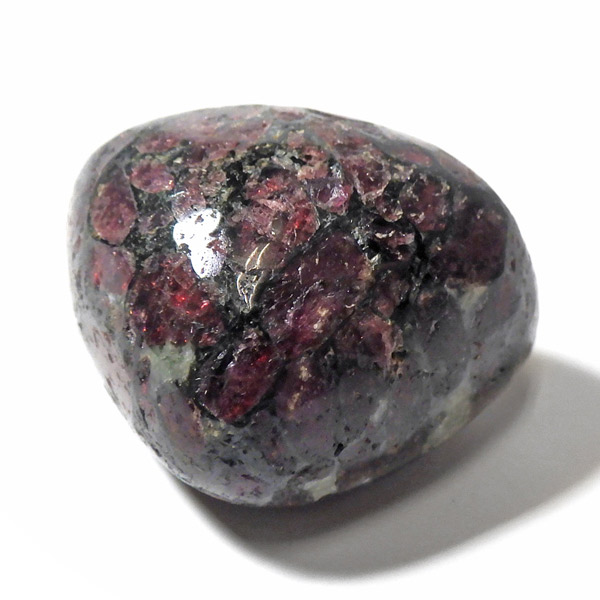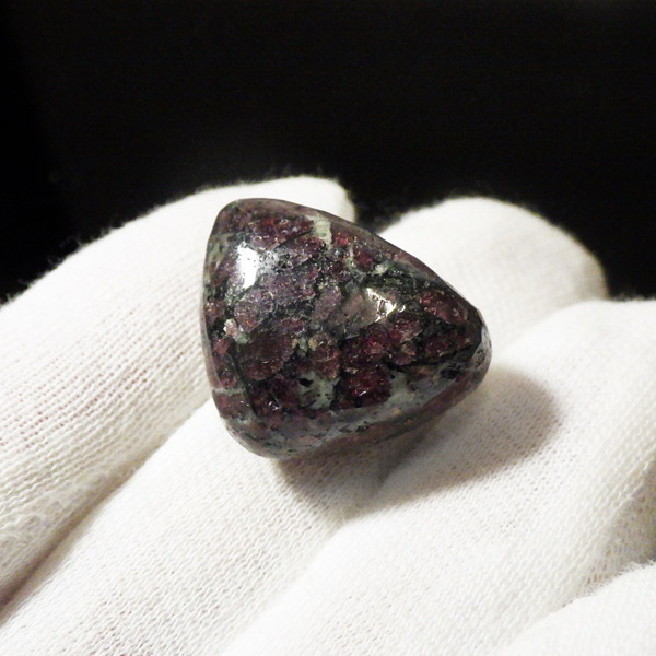 ロシア産のユーディアライト、タンブルです。産出量の少ない希少な石。深いワインレッドとキラキラとした結晶がとてもきれいで、神秘的な輝きを放ちます。赤い色が鮮やかであるほど貴重で、産地であるロシア・ラップランドではラップランドのルビーという愛称があります。ユーディアライトではない母岩部分(おそらくソーダライト)が365nmの波長で蛍光しました。