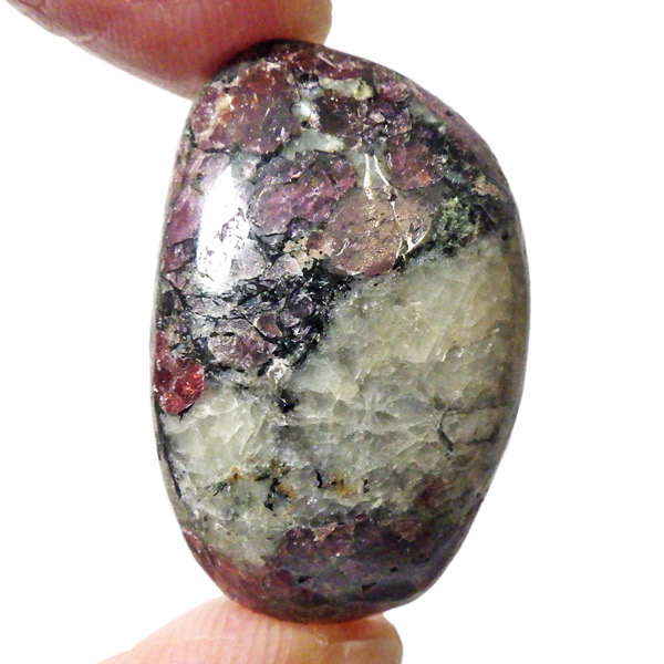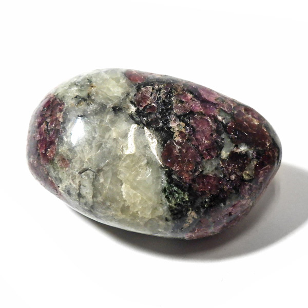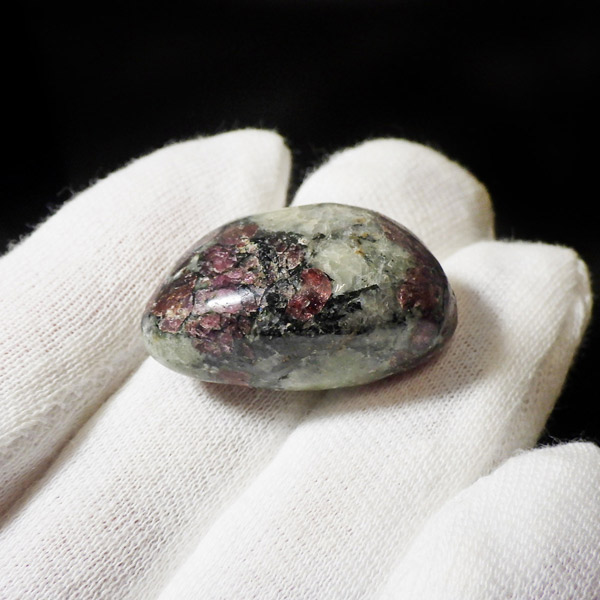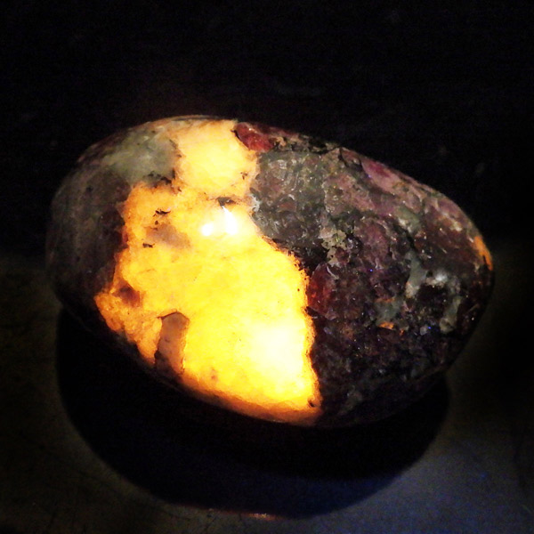 ロシア産のユーディアライト、タンブルです。産出量の少ない希少な石。深いワインレッドとキラキラとした結晶がとてもきれいで、神秘的な輝きを放ちます。赤い色が鮮やかであるほど貴重で、産地であるロシア・ラップランドではラップランドのルビーという愛称があります。ユーディアライトではない母岩部分(おそらくソーダライト)が365nmの波長で蛍光しました。