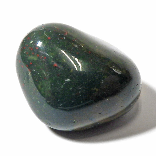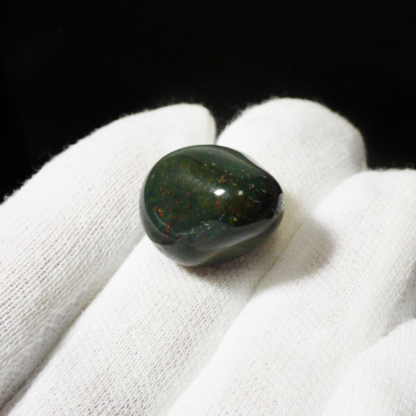 インド産のブラッドストーン、タンブルです。ブラッドストーンはジャスパーの一種で濃緑色の地に赤い斑点や模様の入った石です。鉄に起因する赤い斑点が見られる石で、赤斑点が血の様に見られることからブラッドストーンと呼ばれています。
