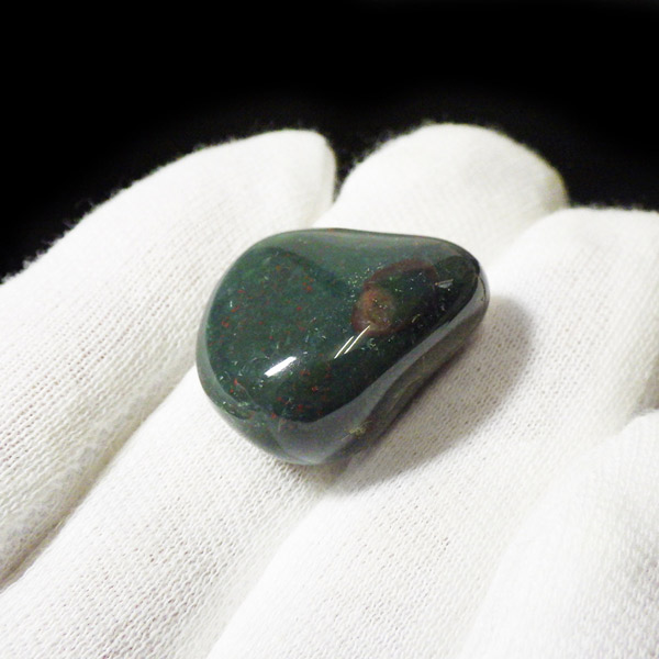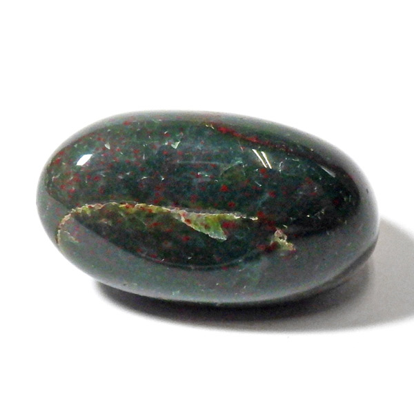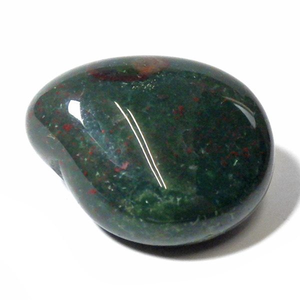 インド産のブラッドストーン、タンブルです。ブラッドストーンはジャスパーの一種で濃緑色の地に赤い斑点や模様の入った石です。鉄に起因する赤い斑点が見られる石で、赤斑点が血の様に見られることからブラッドストーンと呼ばれています。