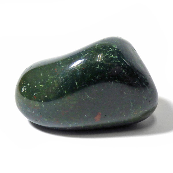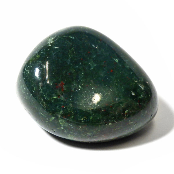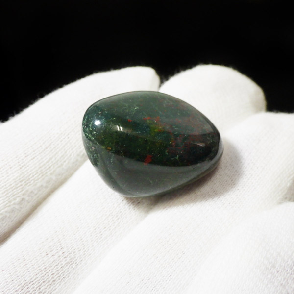 インド産のブラッドストーン、タンブルです。ブラッドストーンはジャスパーの一種で濃緑色の地に赤い斑点や模様の入った石です。鉄に起因する赤い斑点が見られる石で、赤斑点が血の様に見られることからブラッドストーンと呼ばれています。
