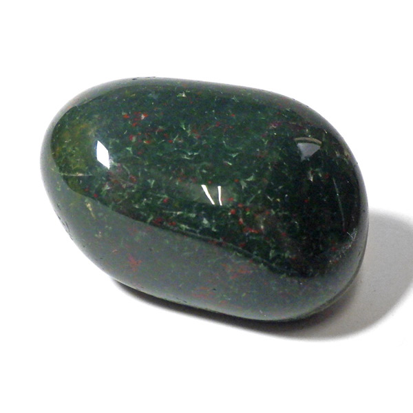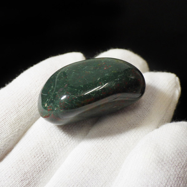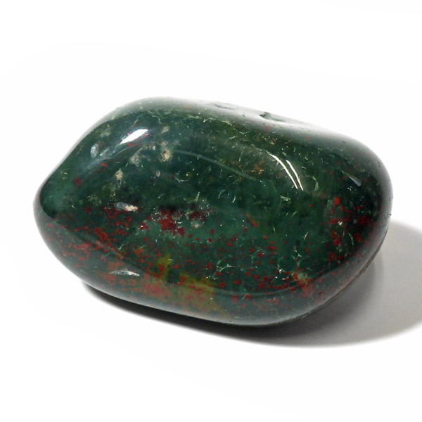 インド産のブラッドストーン、タンブルです。ブラッドストーンはジャスパーの一種で濃緑色の地に赤い斑点や模様の入った石です。鉄に起因する赤い斑点が見られる石で、赤斑点が血の様に見られることからブラッドストーンと呼ばれています。