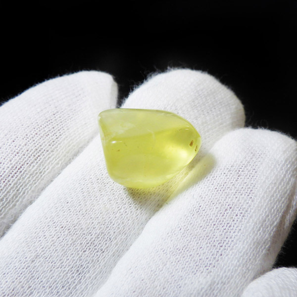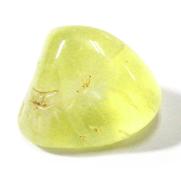 オーストラリア産のイエロープレナイト、タンブルです。和名でぶどう石(葡萄石)と呼ばれており、プレナイトの多くはぶどうの房のような形状で産出します。プレナイトと言えば、和名で「ぶどう石」と呼ばれるようにマスカットカラーが特徴の石ですが、ビビッドなイエローのプレナイトは大変希少です。皮を剥いたみずみずしいぶどうのような、シャインイエローの美しいタンブルです。