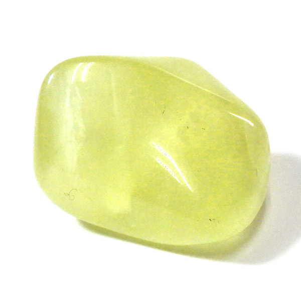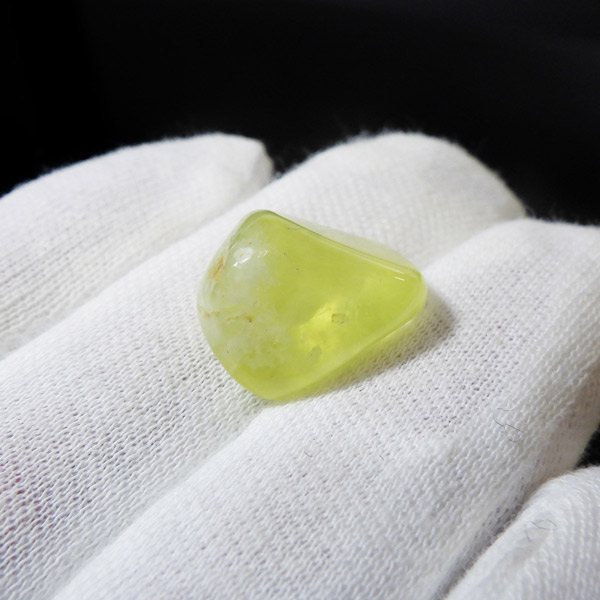 オーストラリア産のイエロープレナイト、タンブルです。和名でぶどう石(葡萄石)と呼ばれており、プレナイトの多くはぶどうの房のような形状で産出します。プレナイトと言えば、和名で「ぶどう石」と呼ばれるようにマスカットカラーが特徴の石ですが、ビビッドなイエローのプレナイトは大変希少です。皮を剥いたみずみずしいぶどうのような、シャインイエローの美しいタンブルです。