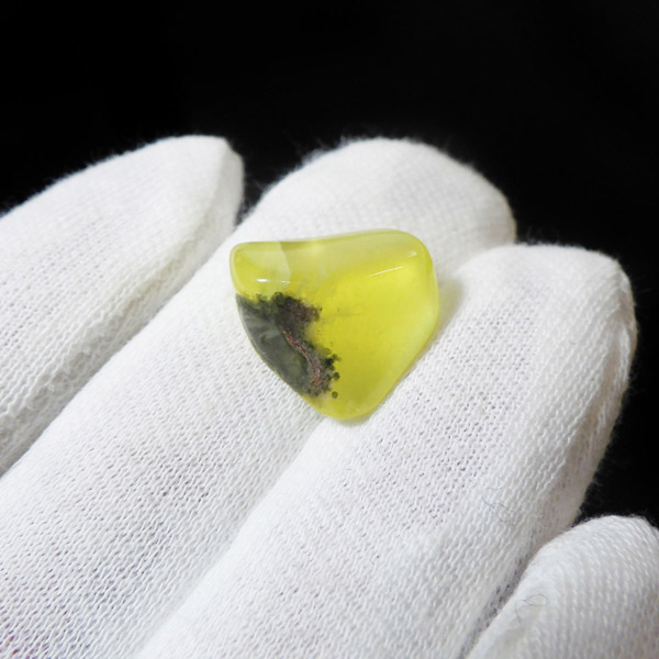 オーストラリア産のイエロープレナイト、タンブルです。和名でぶどう石(葡萄石)と呼ばれており、プレナイトの多くはぶどうの房のような形状で産出します。プレナイトと言えば、和名で「ぶどう石」と呼ばれるようにマスカットカラーが特徴の石ですが、ビビッドなイエローのプレナイトは大変希少です。皮を剥いたみずみずしいぶどうのような、シャインイエローの美しいタンブルです。