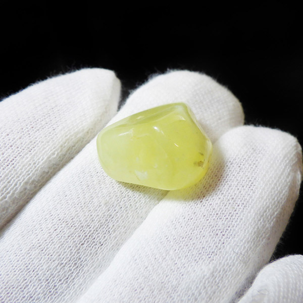 オーストラリア産のイエロープレナイト、タンブルです。和名でぶどう石(葡萄石)と呼ばれており、プレナイトの多くはぶどうの房のような形状で産出します。プレナイトと言えば、和名で「ぶどう石」と呼ばれるようにマスカットカラーが特徴の石ですが、ビビッドなイエローのプレナイトは大変希少です。皮を剥いたみずみずしいぶどうのような、シャインイエローの美しいタンブルです。