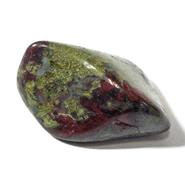 南アフリカ産のドラゴンストーン、タンブルです。 現在では南アフリカまたはオーストラリアで産出される石のようです。ドラゴンストーンまたはドラゴンブラッドジャスパーと呼ばれます。これは、ドラゴンの皮膚を思わせる緑色に、ドラゴンの血をイメージさせる赤い点や筋が入っていることから名付けられています。日本ではあまり文献がないのですが基本はジャスパーだと思われます。こちらは磨いたタンブルですが、原石の状態ですとドラゴン模様の緑の石に本当にドラゴンの血が付いたのではと思わせられます。見た目は綺麗というよりは力強くかっこいい石です。