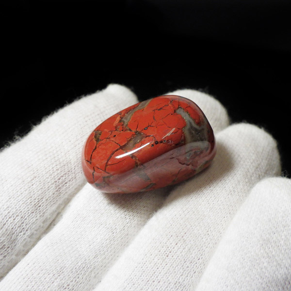 ブラジル産のポピージャスパー、タンブルです。 ジャスパーは、様々な不純物を含んだ石英の総称で、含まれる不純物によって、赤、緑、黄、黒、褐色など、多くの色や模様を持ちます。古くから「聖なる石」と崇められてきた鉱物で、太陽崇拝のインカ帝国では、レッドジャスパーが生命の源の石としてまつりに使用されていたそうです。このポピージャスパーは鮮やかで艶があり、石英によって独特の模様が楽しめます。