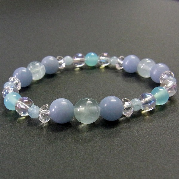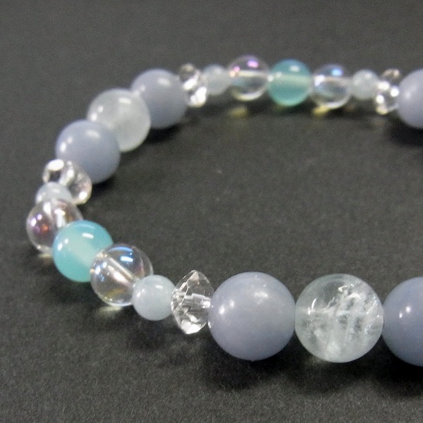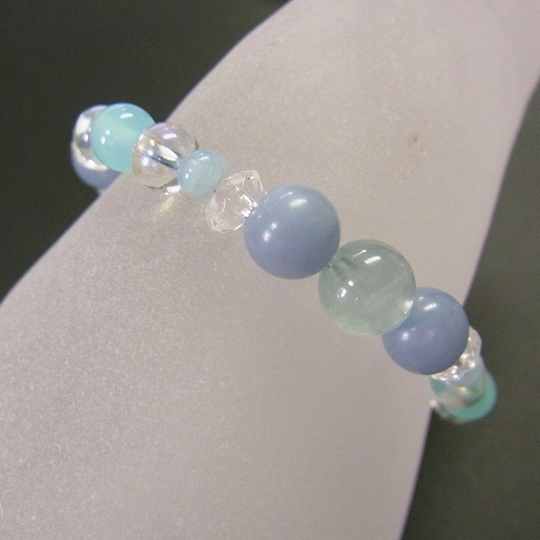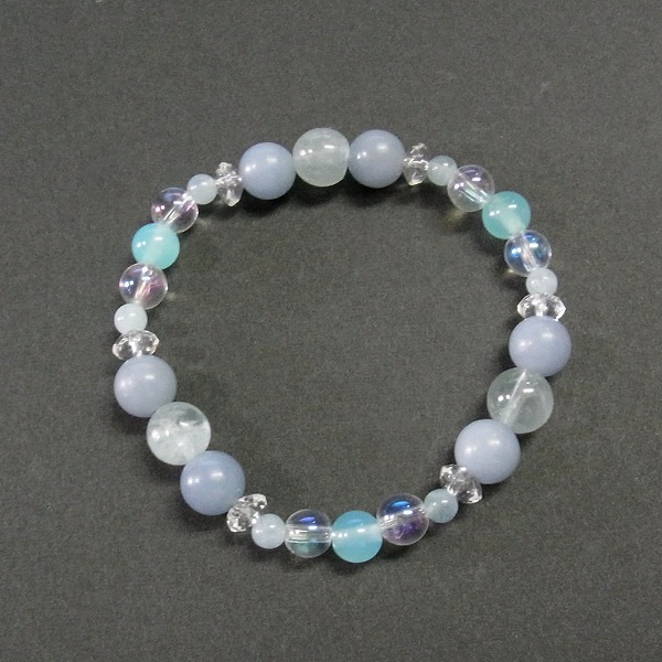 内周15cm アクアマリン8mm×1玉、4mm×6玉、エンジェライト8mm×6玉、シーブルーカルセドニー6mm×3玉、ホワイトオーロラクォーツ6mm×6玉、水晶ボタンカット×6玉