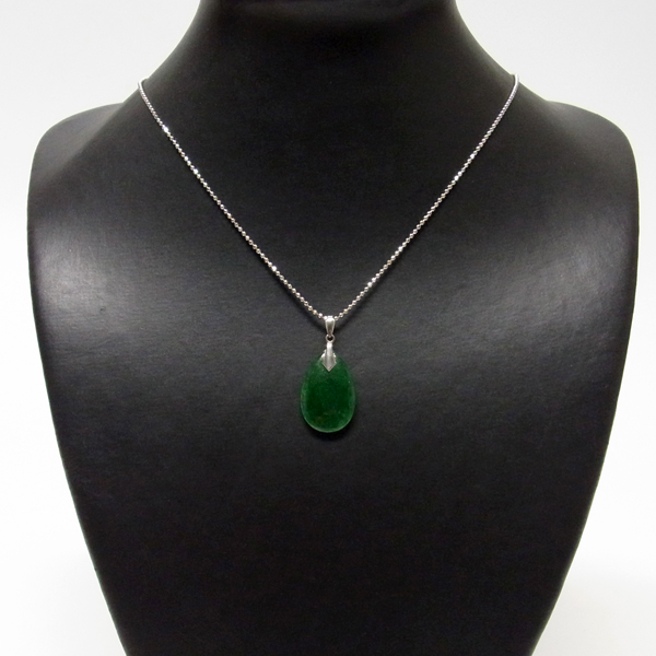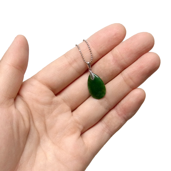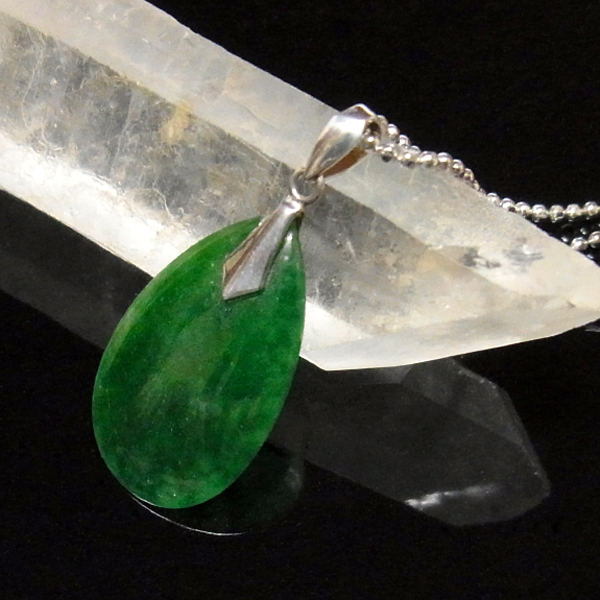 翡翠(ジェダイト)のペンダントトップです。透明感のある深いグリーンが魅力的。古くから勾玉や宝飾品に使われたことで有名な翡翠のアイテム。 透明感を引き出すために薄く加工された質の高い一点です。